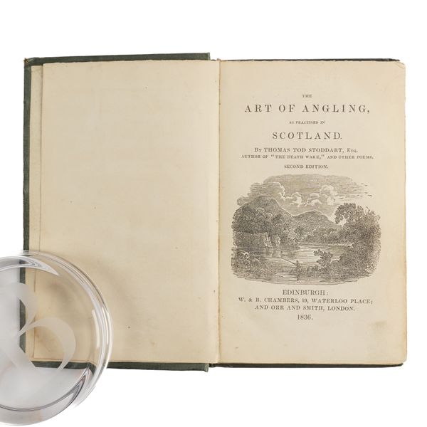 ANGLING - Thomas Tod STODDART (1810-80). The Art of Angling as Practised in Scotland ... Second Edition. Edinburgh: W. & R. Chambers, 1836. Small 8vo (155 x 105mm). Woodcut vignette on the title, illustrations. Original cloth, printed title label on the upper cover (stating, after the title, "Second Edition, greatly enlarged"), the spine lettered in gilt (small piece torn away from the label not affecting letters, bumped). The text is interspersed with unattributed poems or "songs" which are almost certainly the author's own, since, in addition to his writings on angling, he also published at least two collections of verse. Westwood & Satchell Bibliotheca piscatoria (1883) p.203. With 7 other books of related interest, namely Cornwall Simeon's Stray Notes on Fishing and Natural History (Cambridge, 1860, 8vo, frontispiece, original pictorial cloth gilt), Izaak Walton & Charles Cotton's The Complete Angler (London, 1861, 8vo, plates and illustrations, attractively bound in modern half morocco gilt), H. Cholmondeley Pennell's The Angler-Naturalist (London, 1863, 8vo, illustrations, original cloth), the same author's Fishing Gossip (Edinburgh, 1866, 8vo, frontispiece and title vignette, contemporary half morocco, rubbed), Francis Francis's A Book of Angling ... Second Edition (London, 1867, 8vo, plates, original cloth, bookplate of the Oxford Union Society), W. Outram Tristram's Coaching Days and Coaching Ways (London, 1893, 8vo, illustrations, original cloth, dampstained) and The Modern Angler ... By "Otter". New Edition (London, 1898, 8vo plates and illustrations, original pictorial cloth gilt). (8)