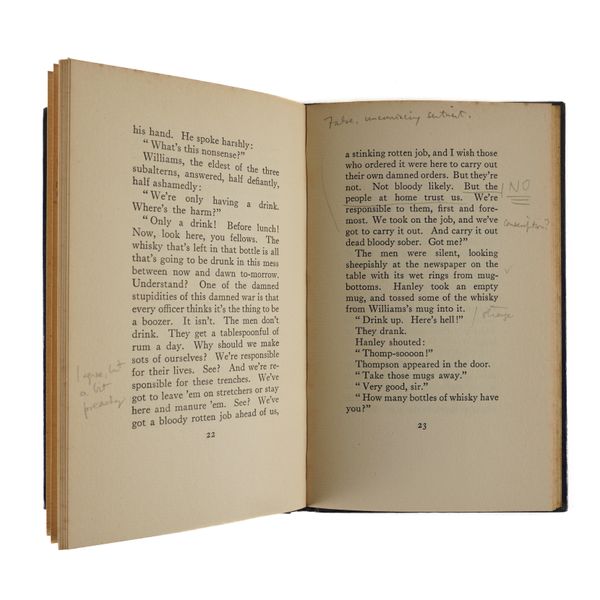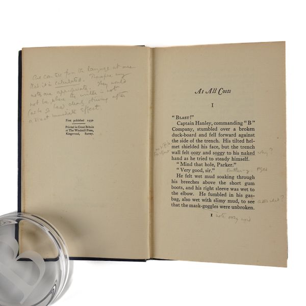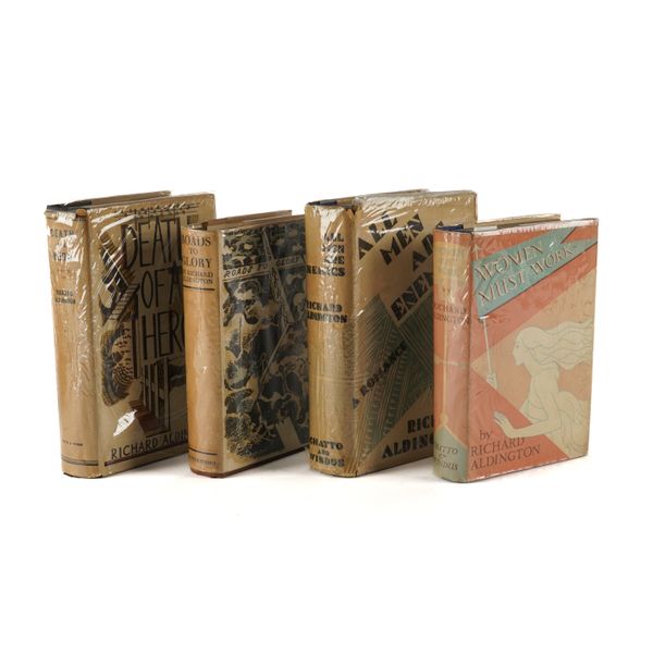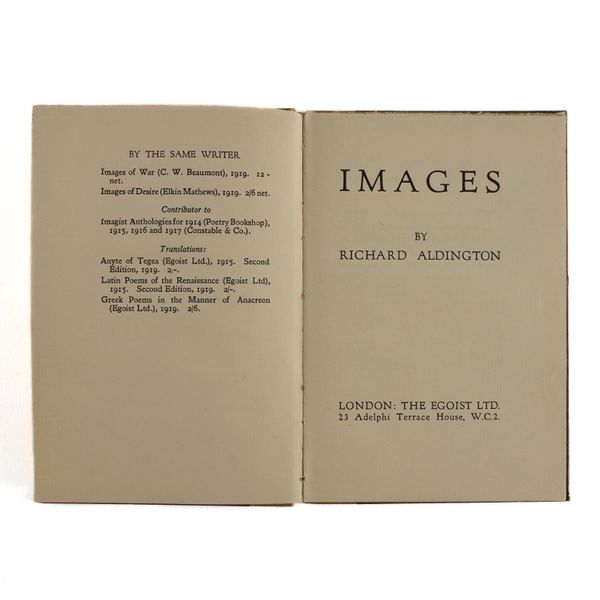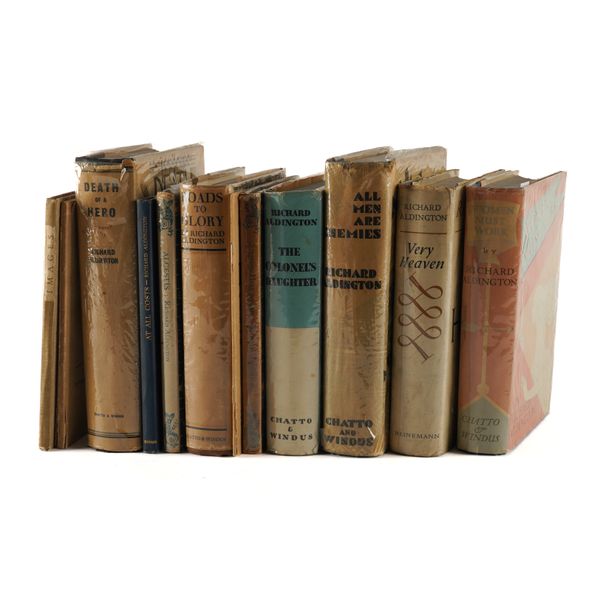ALDINGTON, Richard (1892-1962). Images. London: The Egoist Ltd., [n.d. but ?1919]. 8vo (183 x 125mm). Half title. Original tan buckram-backed brown paper boards with printed label on the upper cover and on the spine. Provenance: "V. E. W. from C. M. Y. 15.10.'19" (inscription on front free endpaper). First published in 1915 by "The Poetry Bookshop", this was the author's first book. The present edition includes a printed note by the author at the front stating: "These poems are taken from 'Images' (Published 1915 and now out of print), and the various Imagist anthologies which are also being allowed to lapse. I have rescued one or two poems from periodicals. There are also one or two newer poems which did not quite fit into my other two books." A publisher's advertisement in the present copy include these 'other two books', namely "Images of War" and "Images of Desire", both of which were first published in 1919. This, combined with the date of the gift inscription at the front, makes us reasonably certain that this edition was printed in 1919. With 11 other books by the same author, or translated by him, namely, The Poems of Meleager of Gadara. Translated by Richard Aldington (London, The Egoist Press, 1920, original stiff wrappers), Death of a Hero (London, 1929, original cloth, dust-jacket), At All Costs (London, 1930, original blue cloth gilt, with copious pencil critical annotation throughout in an unidentified hand), Euripides. Alcestis. Translated by Richard Aldington (London, "The Dolphin Books", 1930, original pictorial paper boards, dust-jacket), Roads to Glory (London, 1930, original cloth, dust-jacket), Balls and Another Book for Suppression (London, "Blue Moon Booklets No. 7", 1931, spotted, original printed wrappers), Stepping Heavenward (London, 1931, "The Dolphin Books", original cloth, dust-jacket), The Colonel's Daughter (London, 1931, original cloth, dust-jacket), All Men are Enemies (London, 1933, original cloth, dust-jacket), Very Heaven (London, 1937, original cloth, dust-jacket) and Women Must Work (London, 1934, original cloth, dust-jacket), all FIRST EDITIONS. Please note that the original dust-jackets (where present) have been photographed in their modern protective archival Mylar wrapper, thereby avoiding any risk of damage through their temporary removal. (12)