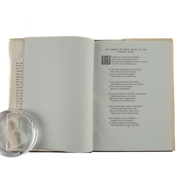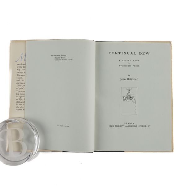 BETJEMAN, John (1906-84). Continual Dew. A Little Book of Bourgeois Verse. London: John Murray, Albemarle Street, 1937. 4to (206 x 146mm). Half title, diagram of a tap on the title page, printed almost entirely on pale blue paper, illustrations and decorations by Hubert de Cronin Hastings, Osbert Lancaster and Gabriel Pippet, initials. Original black textured cloth with decorated lettering and metallic "hinge" design, gilt edges, dust-jacket by Edward McKnight Kauffer with the price of 7/6 unclipped. A FINE COPY OF THE FIRST EDITION OF THE AUTHOR'S SECOND VOLUME OF POETRY which contains two of his most famous poems, "The Arrest of Oscar Wilde at the Cadogan Hotel" and (the contentious) "Slough". "The verse is nostalgic and designed for those who appreciate Sunday in a provincial town, the subtleties of high, low and broad churchmanship, gaslit London, bottle parties in the suburbs, civil servants on the hike, and half-timbered houses on the Southern Electric" (from the turn-in). Please note that the original dust-jacket has been photographed in its modern protective archival Mylar wrapper, thereby avoiding any risk of damage through its temporary removal. Peterson John Betjeman. A Bibliography (2006) A5a.