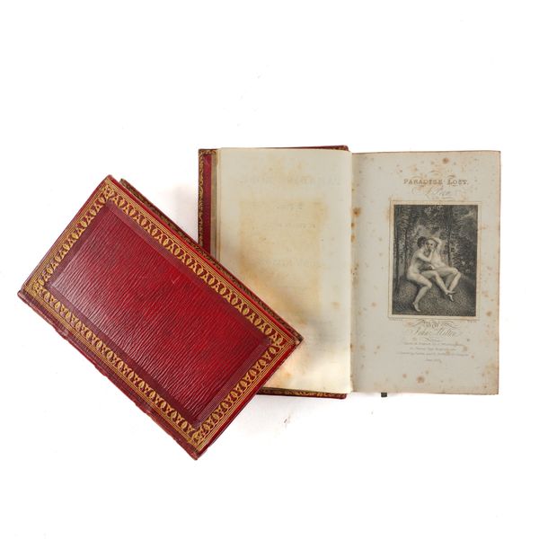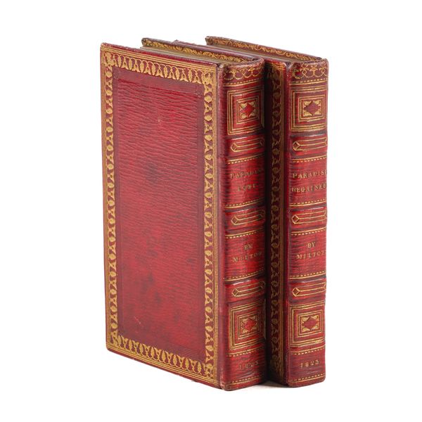 BINDING - John MILTON (1608-74). Paradise Lost, Paradise Regained, Samson Agonistes, Comus, Arcades, Lycidas, Etc. Etc. Chiswick: "From the Press of C. Whittingham, College House," 1823. 2 volumes, small 8vo (128 x 80mm). Half title in vol. one, two additional engraved titles (engraved titles quite heavily spotted, some other light mainly marginal spotting and staining). FINELY BOUND in contemporary straight-grained crimson morocco gilt, the covers with gilt foliate and triple fillet borders, the spines gilt in compartments, gilt edges (a few light scuffs to the covers of the first volume). Provenance: R. Griffin & Co., Glasgow (very small old bookseller's labels on the front free endpapers); partly legible gift inscriptions on the front free endpapers dated 1824. (2)