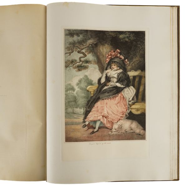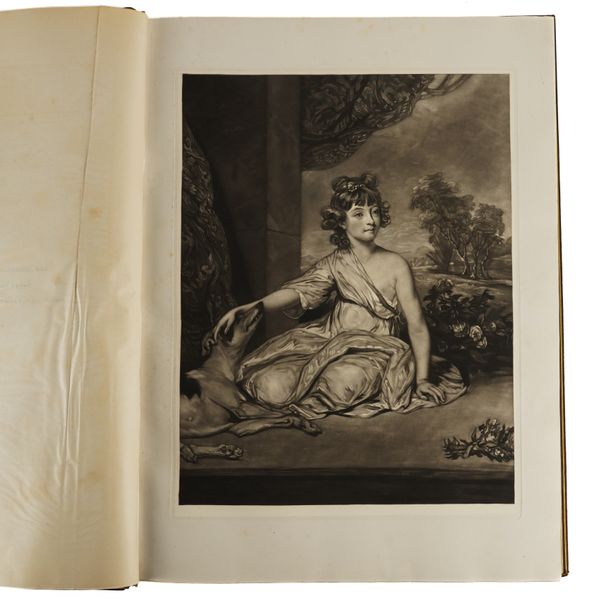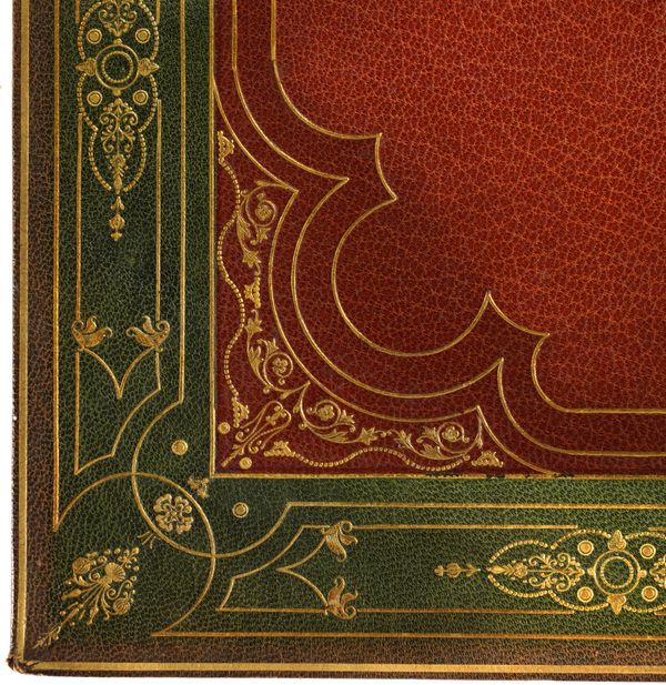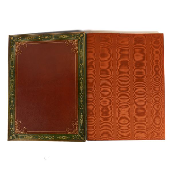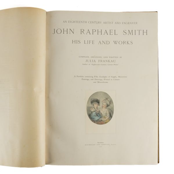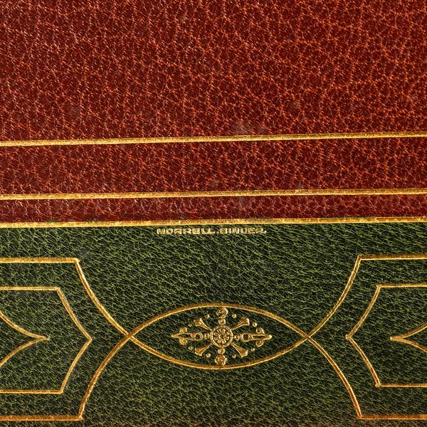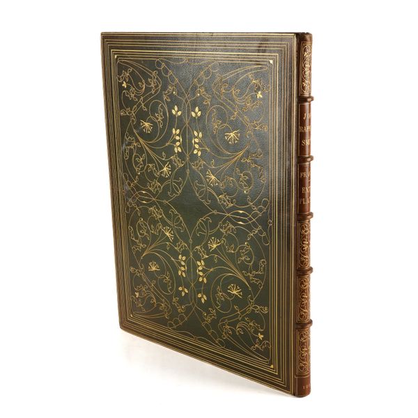 BINDING - Julia FRANKAU (1859-1916). An Eighteenth Century Artist and Engraver. John Raphael Smith. His Life and Works ... A Portfolio containing Fifty Examples of Stipple, Mezzotints Paintings [sic] and Drawings, Printed in Colours and Monochrome. London: Macmillan and Company, 1902. Plate volume only. Very large folio (602 x 445mm). Half title, 50 fine photogravure plates including the title vignette, by John Raphael Smith after Sir Joshua Reynolds, George Romney, John Opie, George Morland and other artists, some coloured, tissue guards (some light spotting and browning to tissue guards, but plate images unaffected). EXCEPTIONALLY FINELY BOUND IN FULL GREEN MOROCCO GILT BY MORRELL, the covers with elaborate tendril and foliate decoration within gilt fillet borders, the spine with 4 raised bands, with foliate decoration in the compartments, wide elaborate dentelles gilt, terracotta watered silk liners (a few inconspicuous scratch marks to the covers, narrow strip lightly rubbed on the lower cover, some very light patches of white staining to the spine and inner edges, corners lightly rubbed, the spine slightly faded). The spine has "Extra Plates" stamped in gilt in one compartment which refers to the 50 plates in the present plate volume rather than the 30 plates in the text volume which is not included here: a printed note indicates its existence on the leaf before the title: "A volume containing a Life of John Raphael Smith, with a Description of Prints and Short Biographies of Persons represented, is issued with this portfolio of prints."