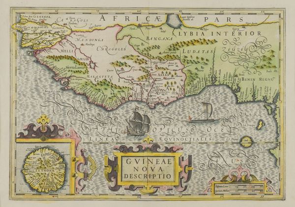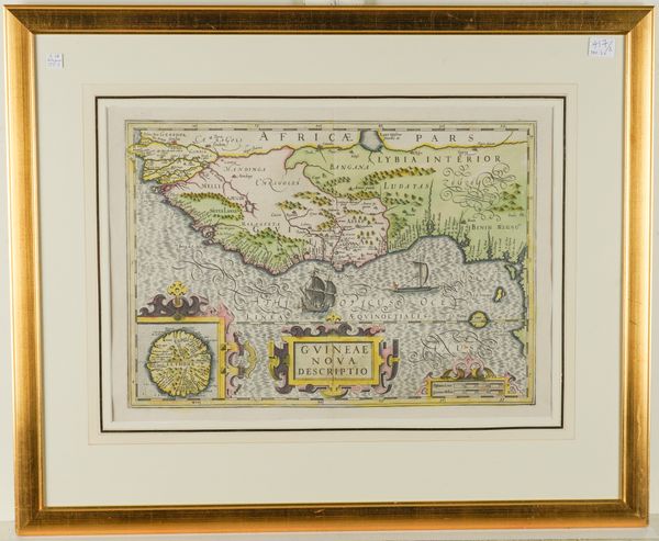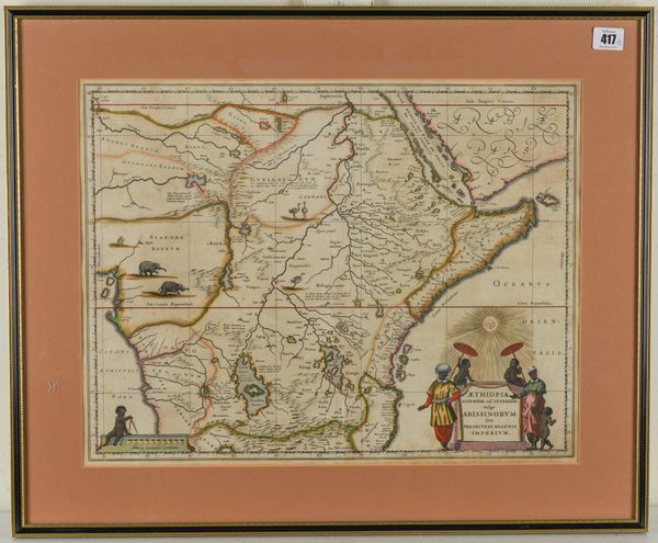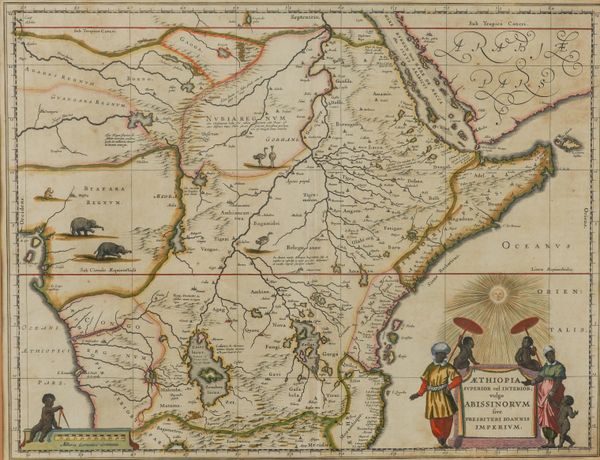 BLAEU, Johannes (1596-1673)]. Æthiopia superior vel interior, vulgo Abissinorum sive Presbiter Joannis Imperium. [Amsterdam: c.1645]. Hand-coloured engraved map, cartouche flanked by four figures of indigenous peoples, with elephants, ostriches and other wildlife (some very light spotting and staining), 380 x 495mm., framed and glazed. Norwich Maps of Africa 154; Tooley Africa p.29. Based on Ortelius's map of 1573, Blaeu's map depicts north-eastern Africa and the fabled Christian kingdom of Prester John ("Presbiter Joannis Imperium"). For a full and fascinating account of this abiding historical hoax and cartographic anomaly, see Edward Brooke-Hitching's "The Phantom Atlas. The Greatest Myths, Lies and Blunders on Maps" (London, 2016, pp.194-7). With Judocus Hondius's Guineae nova descriptio (Amsterdam, [1606 or later], hand-coloured engraved map, 345 x 495mm., framed and glazed). Norwich 316. (2)