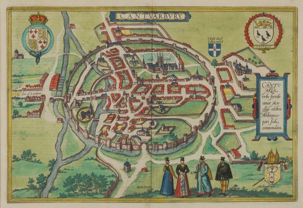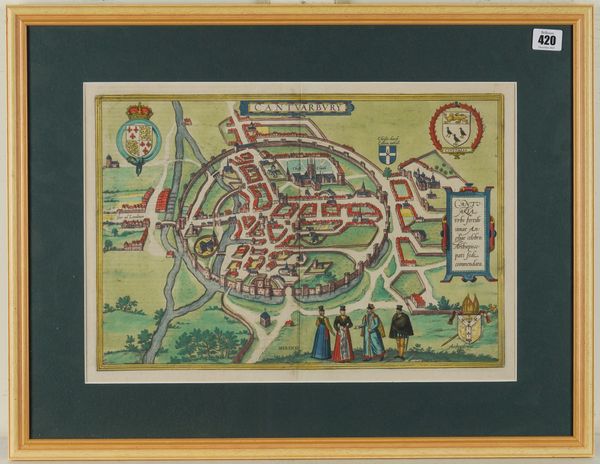CANTERBURY - Georg BRAUN (1541-1622) & Franz HOGENBERG (1536-88). Cantuarbury. Cantuaria urbs fertilissimae Angliae celebris; Archiepiscopati sede, commendata. [Cologne: c.1588]. Hand-coloured engraved bird's-eye-view of Canterbury, 4 costumed figures in the foreground, 3 coats-of-arms including that of the See of Canterbury (some very minor creasing at the centrefold, very small repair at the upper margin, not affecting image), 290 x 430mm., framed and glazed. This highly decorative view is extracted from Braun & Hogenberg's monumental work Civitates orbis terrarum which was published in six volumes between 1572 and 1617. It was the second oldest printed atlas, and the first to include detailed town plans.