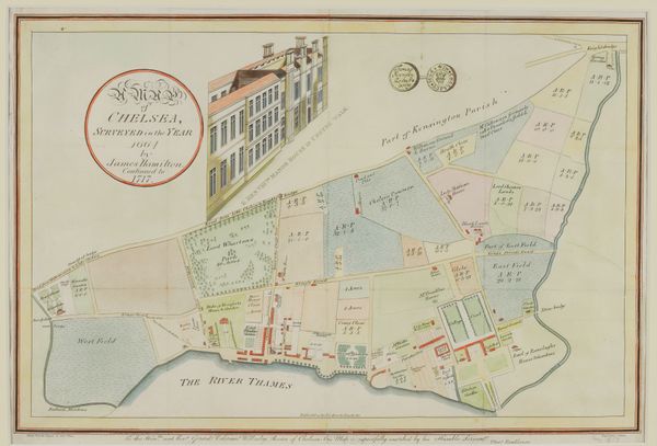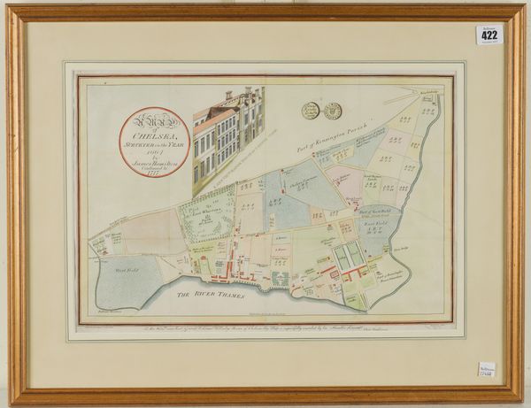 CHELSEA, LONDON - A Map of Chelsea, Surveyed in the Year 1664 by James Hamilton. Continued to 1717. [London:] J. Barlow, 1810 [or later]. Hand-coloured engraved plan by J. Barlow after Edward Ward, with an illustration of King Henry VIII's Manor House in Cheyne Walk and the obverse and reverse of a coin (torn without loss, some light spotting and staining), 290 x 440mm., framed and glazed. The map was first included in Thomas Faulkner's "Historical and Topographical Description of Chelsea", published in London in 1810, and an engraved dedication along the lower border reads, "To the Hon.ble and Rev.d Gerard Valerian Wellesley, Rector of Chelsea, this map is respectfully inscribed by his humble servant, Thos. Faulkner." The map appears in two states: one without the illustrations and without the text "Continued to 1717"; the other - as here - with both.