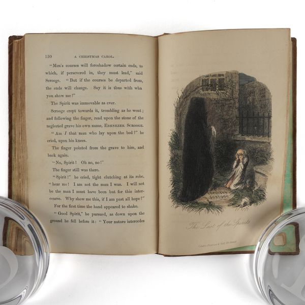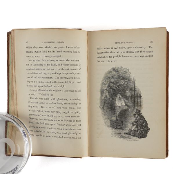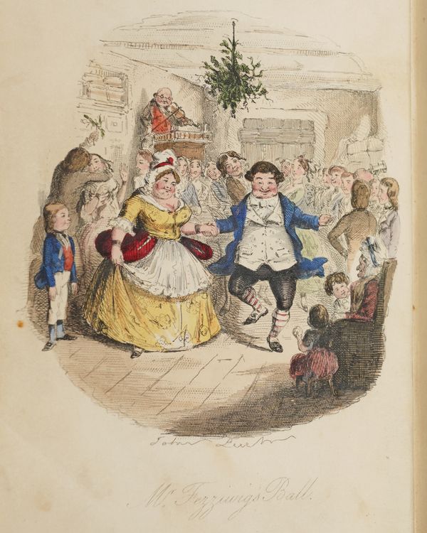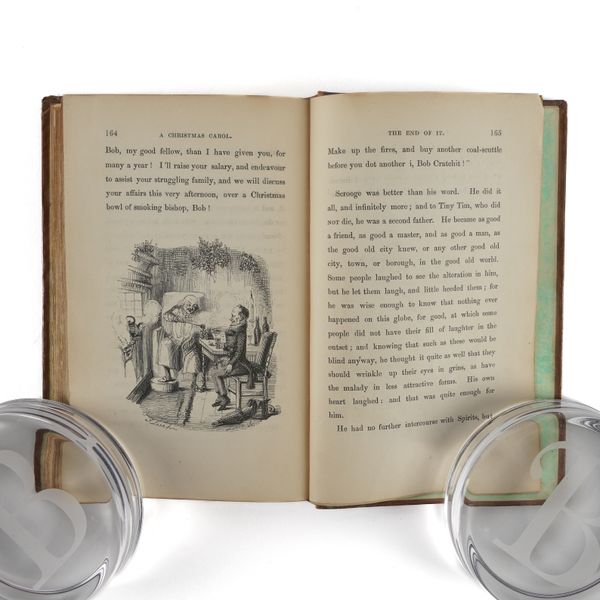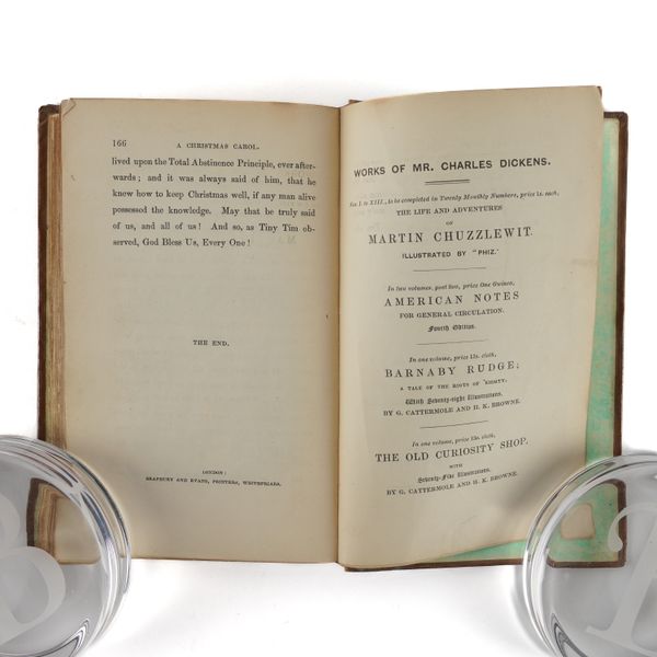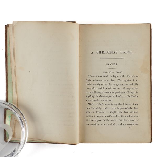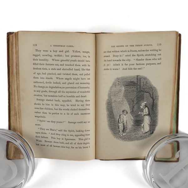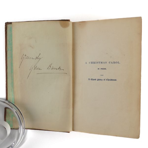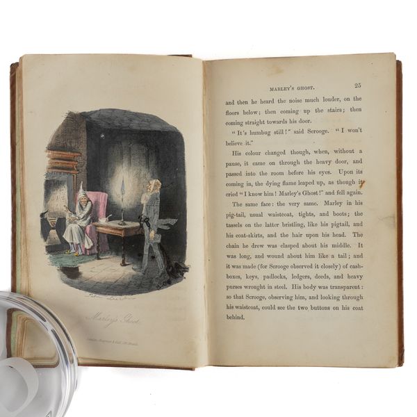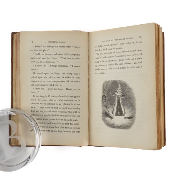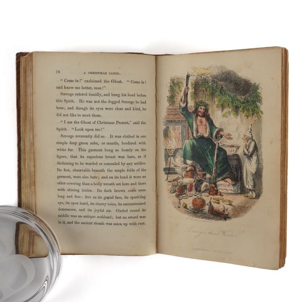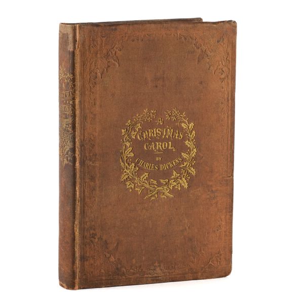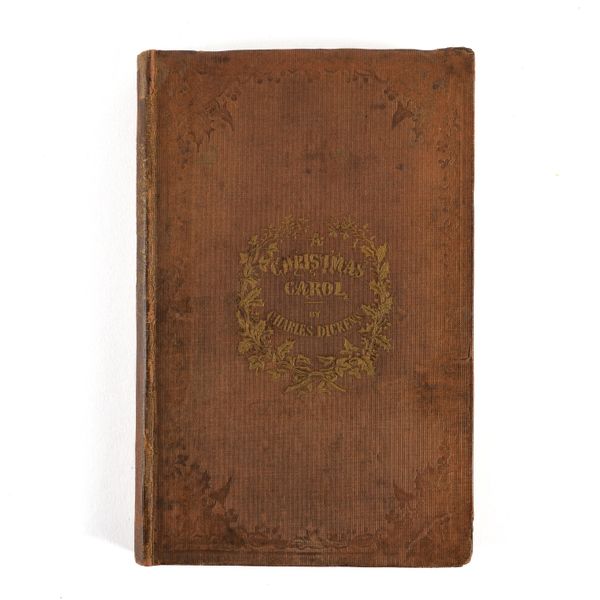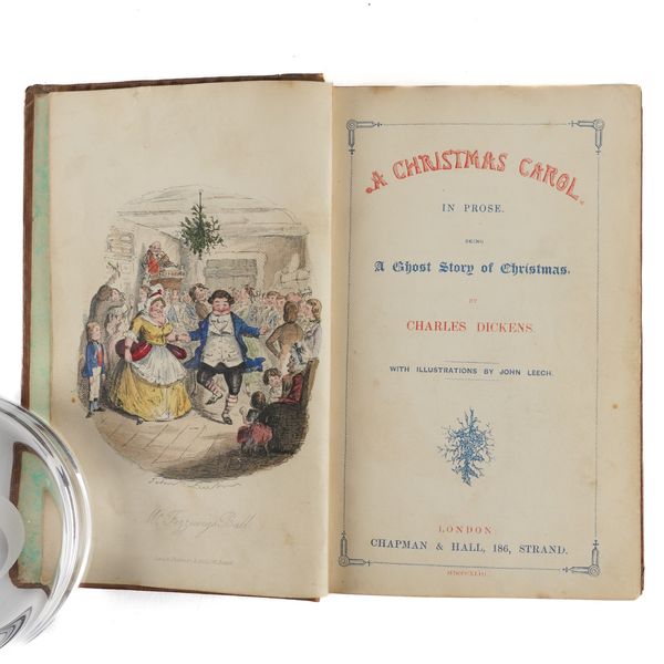 DICKENS, Charles (1812-70). A Christmas Carol. In Prose. Being a Ghost Story of Christmas. London: Chapman & Hall, 1843. 8vo (164 x 102mm). Half title, title printed in red and blue within a blue rule border and a blue woodcut illustration of a sprig of holly, 4 hand-coloured etched plates by John Leech, 4 wood-engraved illustrations in the text by W. J. Linton after John Leech, 2-pages of publisher's advertisements at the end (some light staining mainly at the margin of the title, light spot in the margin of the title, very small stain on p.25, a few faint spots). Original brown vertically-ribbed cloth, the title and author's name within a wreath of holly and ivy stamped in gold on the upper cover with a blind-stamped border of holly and ivy, spine decorated in gilt, gilt edges, pale green endpapers (old repair at the head of the spine, some light rubbing to the joints, two patches of staining to the lower cover, some other light staining). Provenance: "Grundy, Gorse Bank" (old signature on the front free endpaper opposite the half title). FIRST EDITION, FIRST ISSUE, with "Stave I" as the first chapter heading, the date on the title page in Roman numerals, an unbroken "D" in "Dickens" on the front cover, 15mm. distance between the gilt-stamped wreath on the upper and the blind-stamped border (Todd's first issue requirement), and the scarce pale green endpapers. Unlike other Dickens' novels, A Christmas Carol was not initially published in periodical form and so, to the pedant and the purist, this is the true first appearance of the text. Boxall (ed.) 1001 Books p.112: "... The story is darkly comic and tinged with pathos, making the customary Dickensian appeal to the transforming power of sentiment ... Ultimately, though, it is the masterful storytelling that will ensure A Christmas Carol's popularity - it would be a stony heart indeed that did not warm to its charms"; Eckel The First Editions of the Writings of Charles Dickens (1913) p.110: "... the greatest Christmas book ever written in any language ..."; Gimbel [Podeschi] Dickens and Dickensiana: A Catalogue of the Richard Gimbel Collection (1980) A80; Smith Charles Dickens in the Original Cloth; A Bibliographical Record (1982) II.4; Muir English Children's Books 1600-1900 (1954) p.125; Sadleir XIX Century Fiction (1969) 684. See also William B. Todd's article "Dickens's Christmas Carol" in The Book Collector (Winter issue, 1961) for a detailed discussion of issue points relating to the binding in particular. RARE.