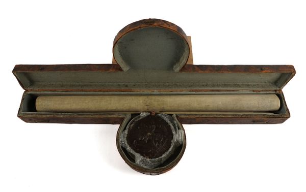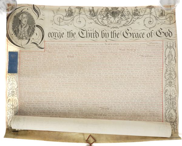 DOCUMENT ON VELLUM - Letters patent granting a baronetcy to Christopher Baynes of Harefield Place, Middlesex, on 2 sheets of vellum, with an engraved portrait of George III at the head of the first sheet, and engraved marginal decoration by J. Hawkins, rubricated, each sheet approximately 600 x 800mm., with a large circular wax seal, diameter 170mm., protected in a metal container, the whole contained in a shaped box, with clasps, [c.1801]. The Baynes Baronetcy was created for Christopher Baynes (1755-1837) on 29 June 1801. He was Major-Commandant of the Uxbridge Gentlemen and Yeomanry Cavalry, which he helped to raise. The title descended from father to son until the death of his great-great-grandson, the fifth baronet, in 1971, whereupon it succeeded to his first cousin, the sixth baronet.