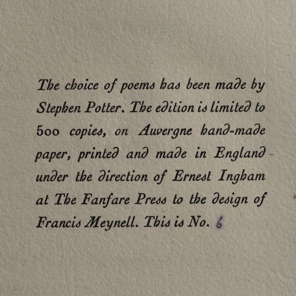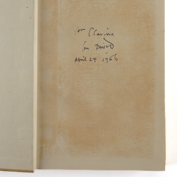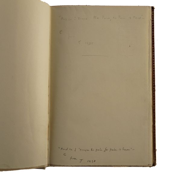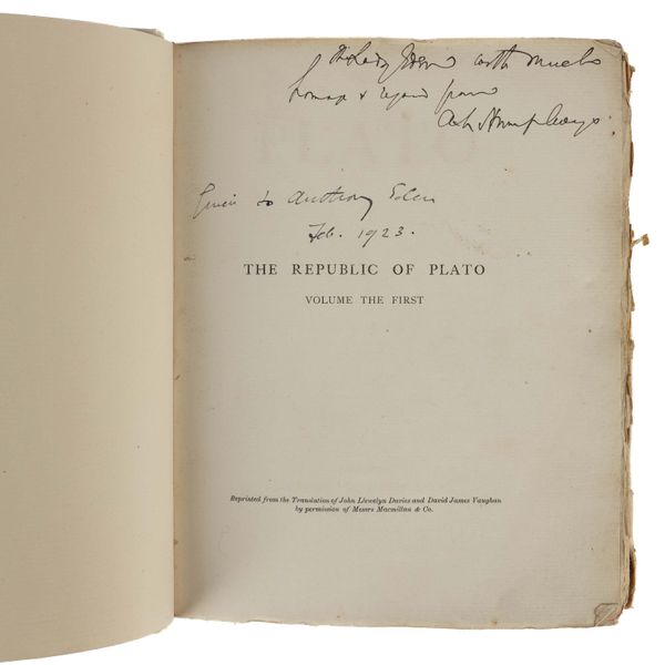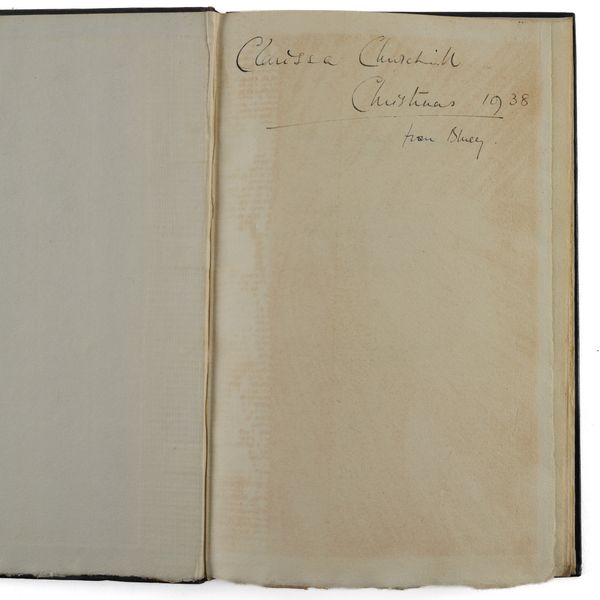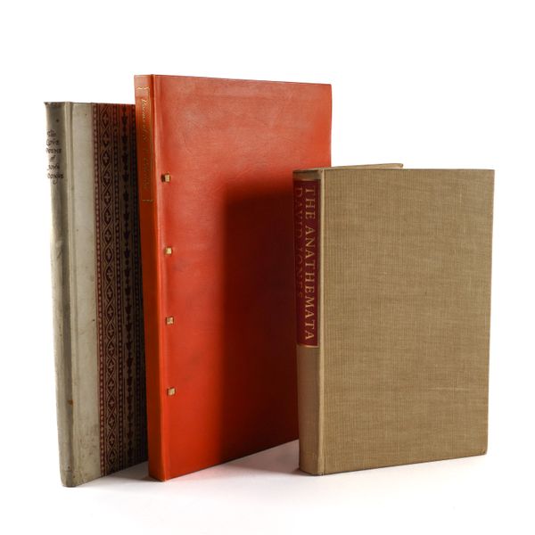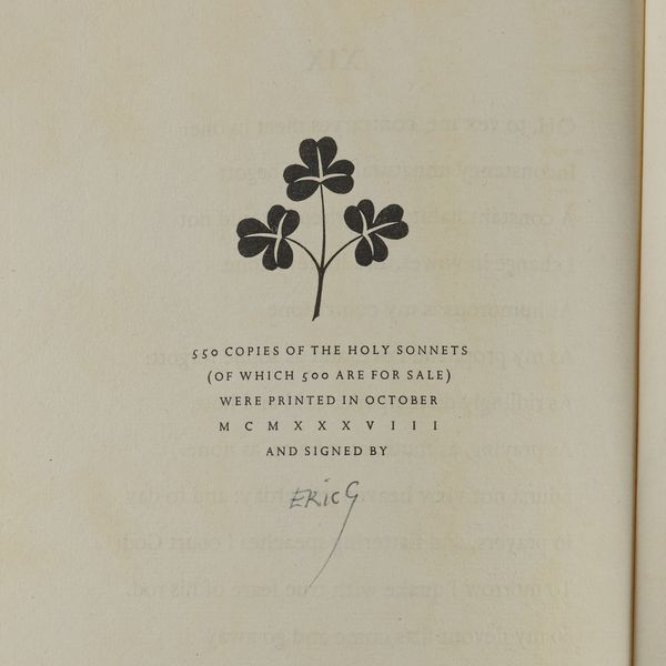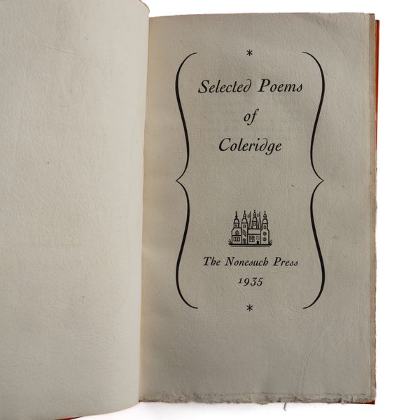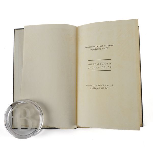 DONNE, John (1572-1631). The Holy Sonnets. Introduction by Hugh I' A. Fausset. London: J. M. Dent & Sons Ltd for Hague & Gill Ltd., 1938. Large 8vo (233 x 150mm). 4 full-page wood-engraved illustrations by Eric Gill, printer's woodcut clover ornament at the end (the last two leaves very lightly browned). Original black buckram lettered and decorated in gilt, uncut. Provenance: "Clarissa Churchill, Christmas 1928, from Bluey" (inscription on the front free endpaper; for further information on the provenance, please see lot 423). ONE OF 550 COPIES SIGNED BY ERIC GILL. Gill Bibliography 298. With 5 other works in 10 volumes, namely Plato's Republic (London, Arthur L. Humphreys, 1898, 2 volumes, 4to, later vellum-backed boards, INSCRIBED BY THE PUBLISHER TO ANTHONY EDEN), Plutarch's The Lives and the Noble Grecians & Romans (London, The Nonesuch Press, 1929, 5 volumes, 4to, illustrations by T. L. Poulton, original tan buckram, NUMBER 193 OF 2,000 COPIES), John Donne's Love Poems ... With some account of his life taken from the writings in 1639 of Izaak Walton (London, The Nonesuch Press, 1923, folio, frontispiece, original vellum-backed decorated boards, inscribed, twice, in pencil on the front free endpaper, "'And so I 'scape the pain For Pain is true'" - C. from J, 1938" [almost certainly inscribed to Clarissa Churchill by John Churchill], NUMBER 148 OF 1,250 COPIES), Samuel Taylor Coleridge's Selected Poems, edited by Stephen Potter (London, The Nonesuch Press, 1935, folio, title vignette by Berthold Wolpe, 3 plates by Stefan Mrozewski, original limp orange vellum gilt, NUMBER 6 OF 500 COPIES) and David Jones' The Anathemata. Fragments of an Attempted Writing ... Second edition (London, 1955, 8vo, original tan buckram, without a dust-jacket, PRESENTATION COPY, the front free endpaper inscribed, "For Clarissa, from David [Jones], April 24 1956." (9)