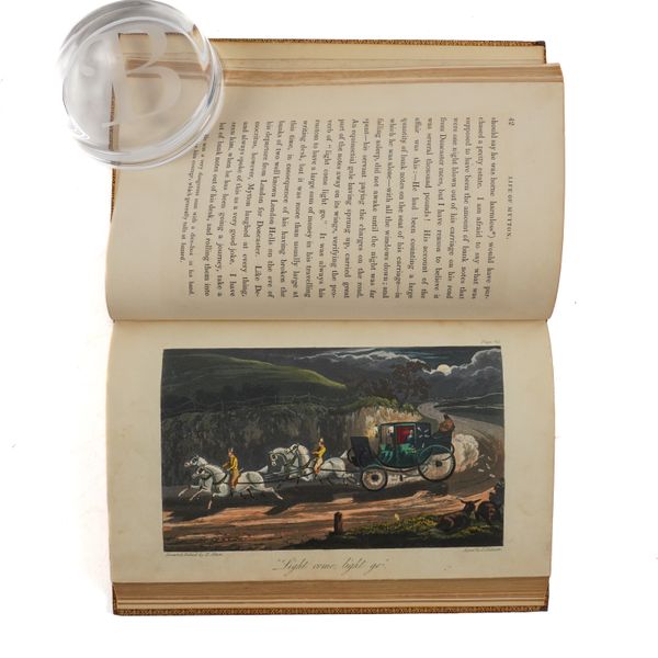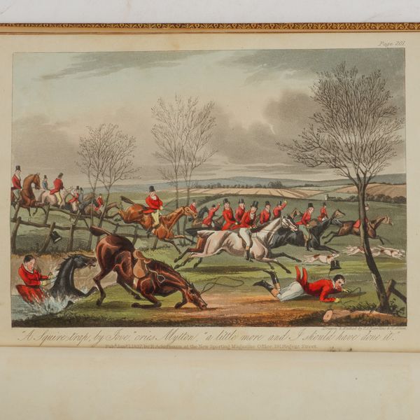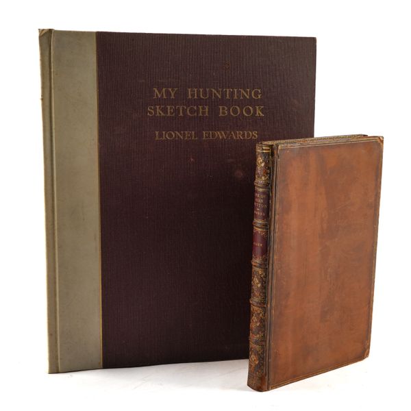 EDWARDS, Lionel (1878-1966, illustrator). My Hunting Sketch Book. London: Eyre and Spottiswoode Limited, 1928. 4to (317 x 250mm). Half title, 15 mounted coloured plates by Lionel Edwards (occasional light mainly marginal spotting). Original vellum-backed burgundy cloth boards lettered in gilt, top edges gilt, others uncut. FIRST EDITION. NUMBER 226 OF 250 COPIES SIGNED BY THE ARTIST. With [Charles James Apperley's] Memoirs of the Life of the Late John Mytton, Esq. ... with Notices of his Hunting, Shooting, Driving, Racing, Eccentric and Extravagant Exploits. By Nimrod ... Second Edition, Reprinted (with Considerable Additions) from the New Sporting Magazine (London, Rudolph Ackermann, 1837, 8vo, 18 fine hand-coloured aquatint plates by H. Alken and T. J. Rawlins, contemporary calf gilt, rebacked with some repairs). (2)