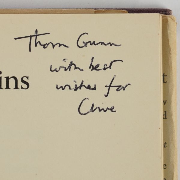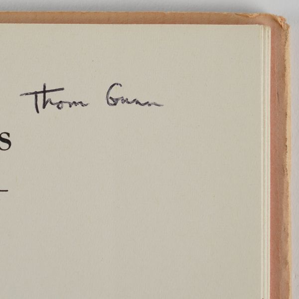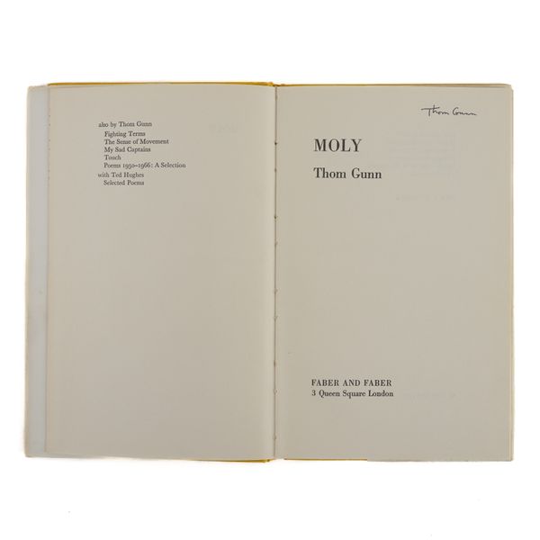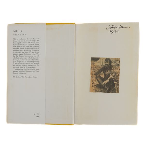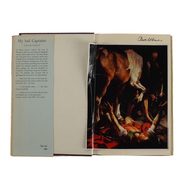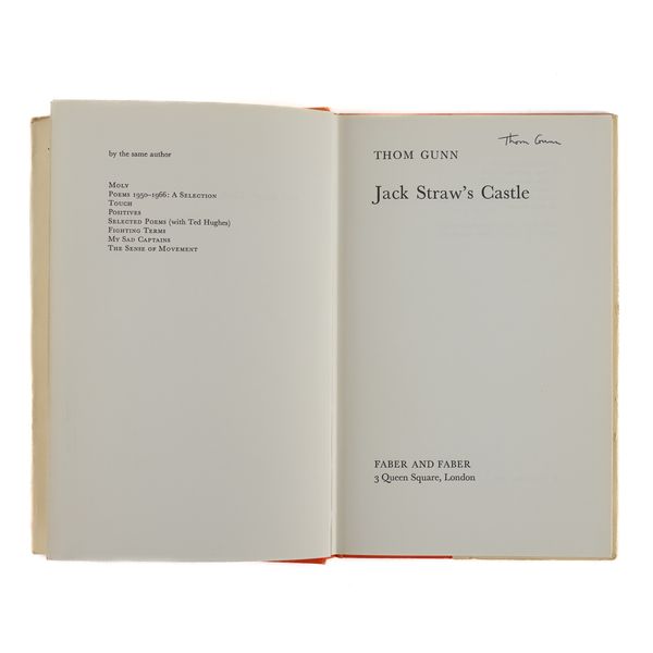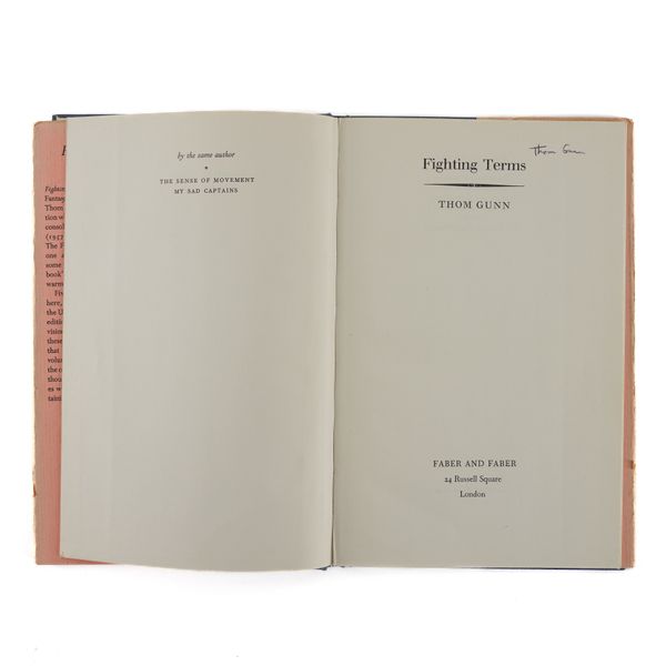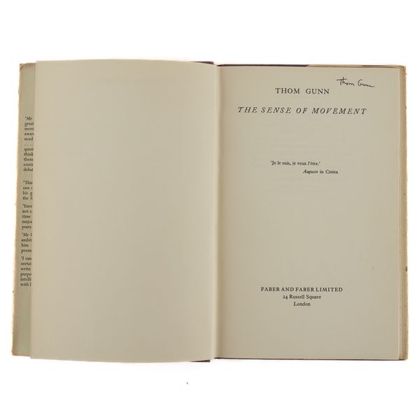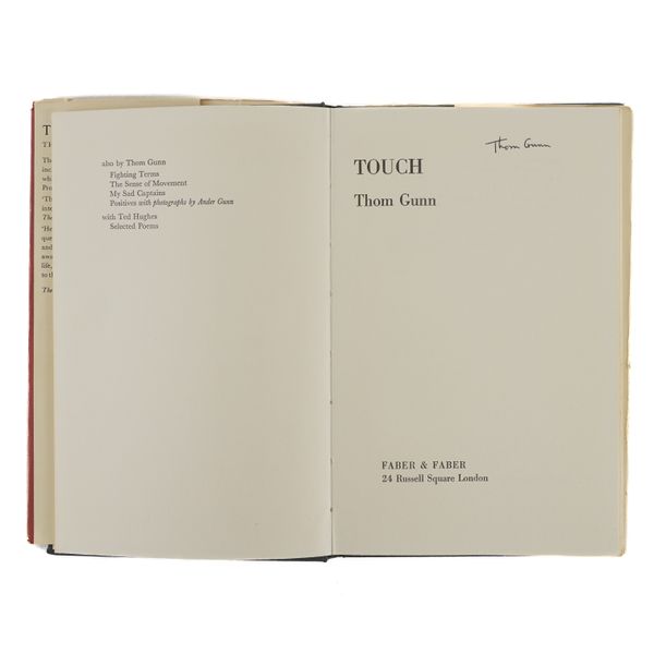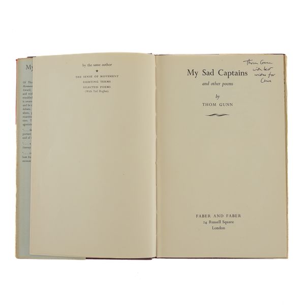 GUNN, Thom (1929-2004). My Sad Captains and other poems. London: Faber and Faber, 1962. 8vo (217 x 140mm). Half title. Original purple cloth, the spine lettered in gilt, dust-jacket with the price of 12s 6d. unclipped (the jacket with a few short tears and very slight loss at the corners). Provenance: Clive Wilmer (signature on the front free endpaper); a few pencil notes by the same. FIRST EDITION, second impression, PRESENTATION COPY, inscribed on the title page, "Thom Gunn, with best wishes for Clive." A modern reproduction of Caravaggio's "Conversion on the Way to Damascus" is pasted onto the front free endpaper. With 5 other books by Thom Gunn, namely, Fighting Terms (London, 1962, original cloth, dust-jacket, reprint based on the 1954 original with a printed note on the verso of the title stating: "This edition with revisions first published in 1962"), The Sense of Movement (London, 1963, original cloth, dust-jacket, third impression), Touch (London, 1967, original cloth, dust-jacket, FIRST EDITION), Moly (London, 1971, original cloth, dust-jacket, FIRST EDITION, with a newspaper photograph of the poet pasted onto the front free endpaper) and Jack Straw's Castle (London, 1976, original cloth, dust-jacket), ALL SIGNED BY THOM GUNN on the title pages. "[Thom Gunn's] celebration of men of action (soldiers, motorcyclists, tough boys), his fascination with violence, his gallery of heroes (who range from Elvis Presley to Caravaggio), together with his predominantly low-key, rational, laconic, colloquial manner provide an interesting synthesis of the English Movement and the romantic elements of American Beat Poetry" (The Oxford Companion to English Literature, ed. Drabble, 1985). Provenance: From the Collection of Clive Wilmer (1945-2025; please see lot 418 for further biographical information about Clive Wilmer, in particular the section relating to Thom Gunn, with whom Clive Wilmer, a distinguished poet himself, maintained an enduring friendship over forty years). (6)