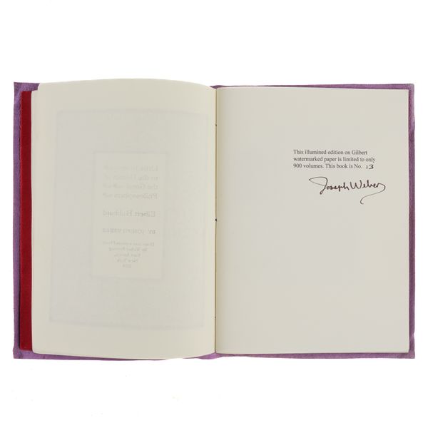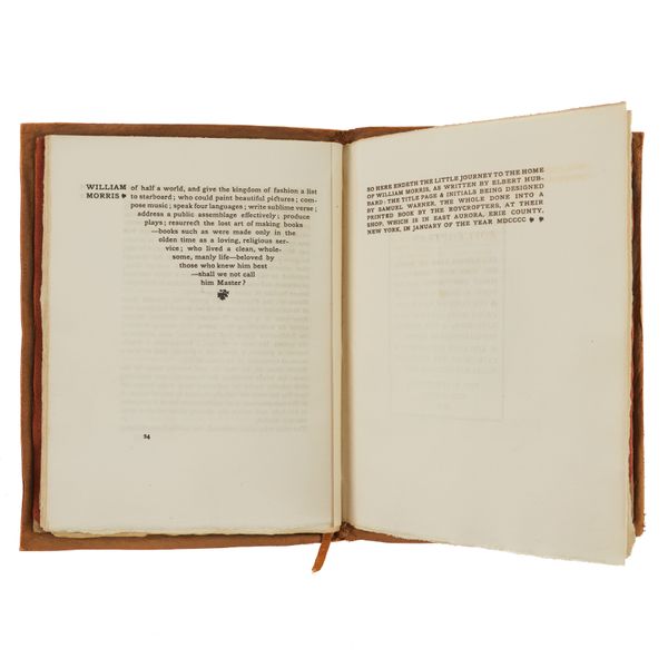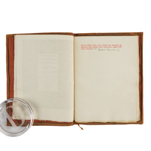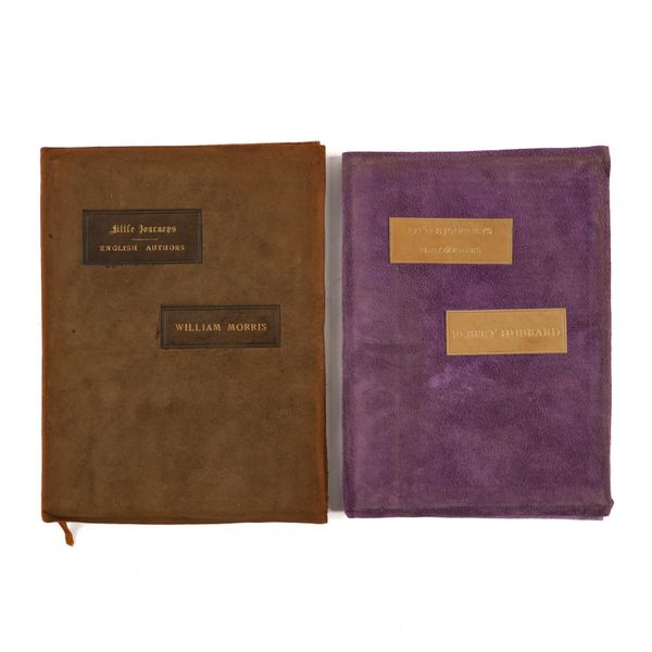 HUBBARD, Elbert (1856-1915). Little Journeys to the Homes of English Authors ... William Morris. Done into print by the Roycrofters at the Roycroft Shop. East Aurora, Erie County, New York: The Roycrofters, 1900. Small 4to (195 x 150mm). Title within elaborate coloured border designed by Samuel Warner, full-page portrait of William Morris after George Frederick Watts, coloured initials, portrait of Elbert Hubbard on rice-paper at the end. Original suede wrappers lettered in gold. FIRST EDITION. NUMBER 767 OF 925 COPIES SIGNED BY THE AUTHOR. With Joseph Weber's Little Journey to the Homes of the Great Philosophers. Elbert Hubbard ... Done into a printed book by Joseph Weber (East Aurora, New York, 2008, small 4to, portrait and coloured decorations, original suede wrappers lettered in gold, FIRST EDITION, NUMBER 13 OF 900 COPIES SIGNED BY JOSEPH WEBER). Provenance: From the Collection of Clive Wilmer (1945-2025; please see lot 418 for further biographical information). (2)