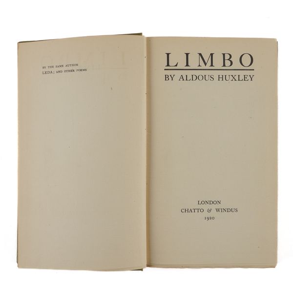 HUXLEY, Aldous (1894-1963). Limbo. London: Chatto & Windus, 1920. 8vo (190 x 110mm). Half title. Original green buckram, the spine with paper label printed in orange, with 2 fragments of the dust-jacket (the turn-ins?). A FINE COPY OF THE FIRST EDITION OF THE AUTHOR'S FIRST PUBLISHED FICTION, which took the form of "novelette", a play and five short stories. Previously, Huxley had only published four collections of poetry. Eschelbach & Shober Aldous Huxley: A Bibliography (1961) 40. RARE.
