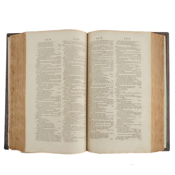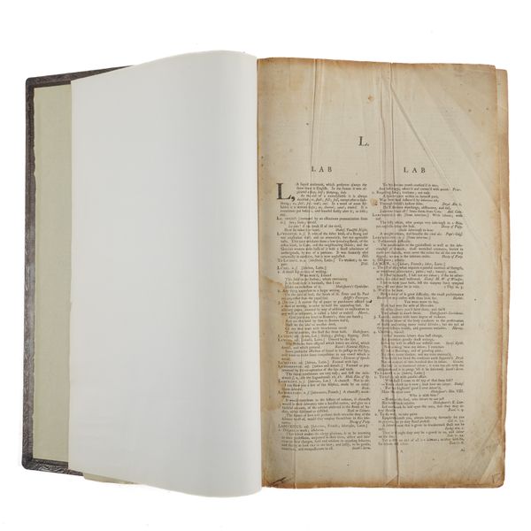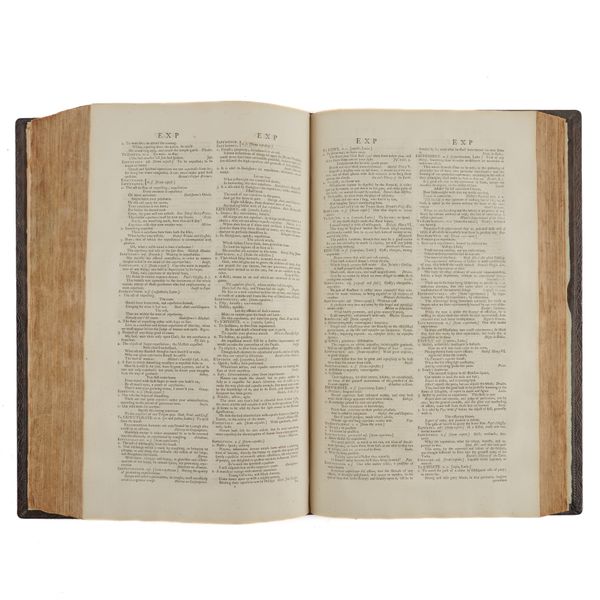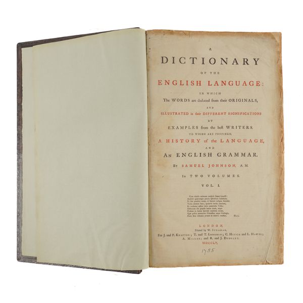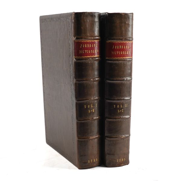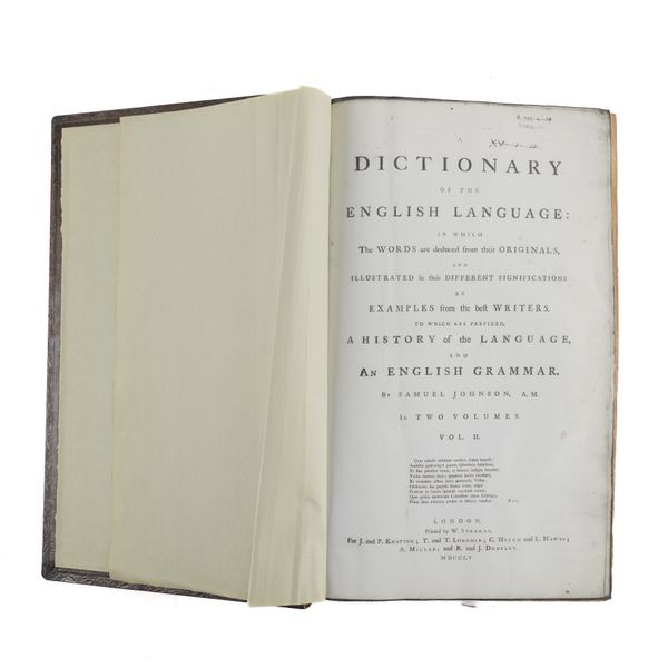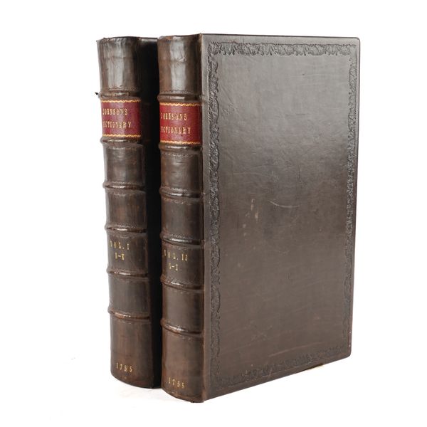JOHNSON, Samuel (1709-84). A Dictionary of the English Language: in which the Words are Deduced from their Originals, and Illustrated in their Different Significations by Examples from the Best Writers, to which are Prefixed, a History of the Language and an English Grammar. London: "Printed by W. Strahan, For J. and P. Knapton; T. and T. Longman; C. Hitch and L. Hawes; A. Millar; and R. and J. Dodsley," 1755. 2 volumes, folio (420 x 260mm). Title to volume one printed in red and black, printed almost entirely in double column, ornaments (lacking the title page to volume two which has been supplied in functional modern facsimile, followed immediately by the leaf with the signature 15A, the title page to volume one lightly browned and torn at the edges and frayed without loss, some mainly marginal staining at the front and end of volume one, occasional mainly light marginal spotting and staining). Modern old-style calf (lightly scuffed, new endpapers). Provenance: From the Collection of Clive Wilmer (1945-2025; please see lot 418 for further biographical information); G. David Bookseller, Cambridge (small modern bookseller's label on the front pastedowns). FIRST EDITION, FIRST ISSUE, conforming to Todd's requirements of the first issue that the verso of 19D has the press figure '9' and the verso of the following leaf the figure '7'. In addition, the seventh definition of the word "Part" has the quotation sources both written out in full (Bacon's Natural History and Milton's Paradise Lost) rather than abbreviated, as they were the in second issue. "Dr Johnson performed with his Dictionary the most amazing, enduring and endearing one-man feat in the field of lexicography ... The preface ranks among Johnson's finest writings ... It is the dictionary itself which justifies Noah Webster's statement that 'Johnson's writings had, in philology, the effect which Newton's discoveries had in mathematics'. Johnson introduced into English lexicography principles which had already been accepted in Europe but were quite novel in mid-eighteenth-century England. He codified the spelling of English words; he gave full and lucid definitions of their meanings (often entertainingly coloured by his High Church and Tory propensities); and he adduced extensive and apt illustrations from a wide range of authoritative writers ... [D]espite the progress made during the past two centuries in historical and comparative philology, Johnson's book may still be consulted for instruction as well as pleasure" (PMM). Brunet II, 725 (citing the fourth edition of 1773); Chapman & Hazen Johnsonian Bibliography (1938) p.137; Courtney & Smith A Bibliography of Samuel Johnson (1915) p.54; Fleeman A Bibliography of the Works of Samuel Johnson (2000) I, p.410; PMM 201; The Rothschild Library. A Catalogue of the Eighteenth-Century Printed Books and Manuscripts formed by Lord Rothschild 1237. (2)