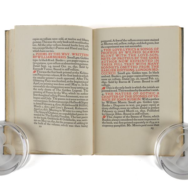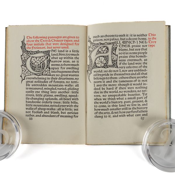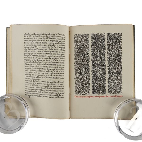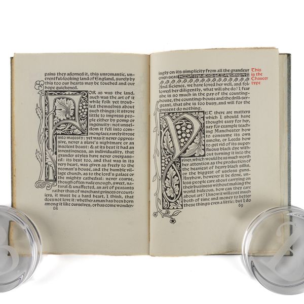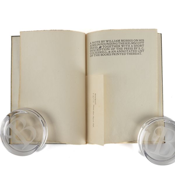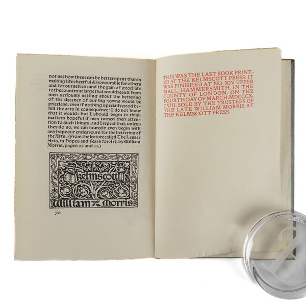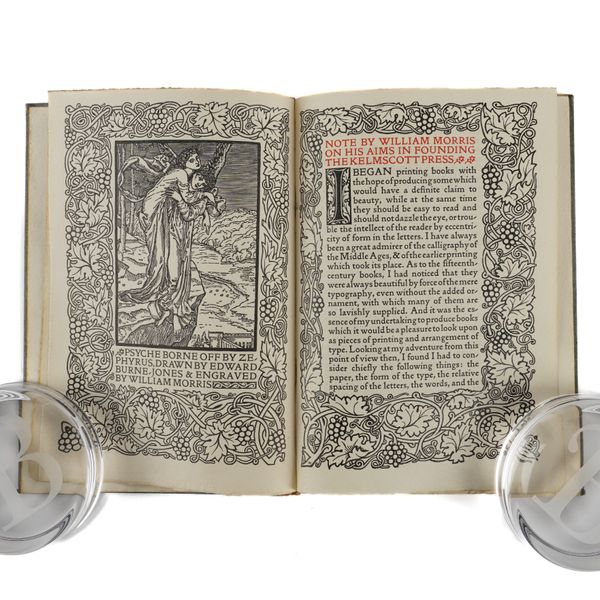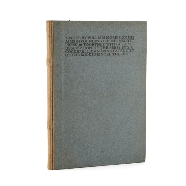 KELMSCOTT PRESS - William MORRIS (1834-96). A Note by William Morris on his Aims in Founding the Kelmscott Press. Together with a Short Description of the Press by S. C. Cockerell, & an Annotated List of the Books Printed Thereat. Hammersmith: The Kelmscott Press, 1898. Large 8vo (208 x 140mm). Printed in red and black in Golden, Troy and Chaucer types, woodcut illustration by Edward Burne-Jones of "Pysche Borne off by Zephyrus" engraved by William Morris, woodcut decorative borders and initials by William Morris with the Kelmscott Press device at the end, the colophon printed in red, erratum slip loosely-inserted (stating "Misprint: p.44, l.12. Please alter 1893 to 1896", but not corrected in this copy). Original holland-backed blue paper boards, the upper cover lettered in black. Provenance: From the Collection of Clive Wilmer (1945-2025; please see lot 418 for further biographical information); Edmund Bulkley (bookplate). ONE OF 525 COPIES of this final production and valedictory summation of the work of the Kelmscott Press, arguably the finest 'Private Press' ever to have existed. Under the exacting supervision and design of its founder William Morris, the press printed 53 books in 66 volumes over the seven years of its existence. The colophon states: "This was the last book printed at The Kelmscott Press. It was finished at No. XIV Upper Mall, Hammersmith, in the County of London, on the Fourth Day of March, MDCCCXCVIII. Sold by the Trustees of the Late William Morris at the Kelmscott Press." Peterson A Bibliography of The Kelmscott Press (1984) A53; Ransom Private Presses and their Books (1963) 53; Sparling The Kelmscott Press and William Morris Master-Craftsman (1924) 53; Tomkinson A Select Bibliography of the Principal Modern Presses (1928) 53. See Alan G. Thomas's Great Books and Book Collectors (1975), pp.215-221, for an adulatory account of the press's foundation and production which includes a reproduction of the double-page spread of Burne-Jones's 'frontispiece' illustration and the title page of the present work. AN EXCEPTIONALLY FINE COPY.