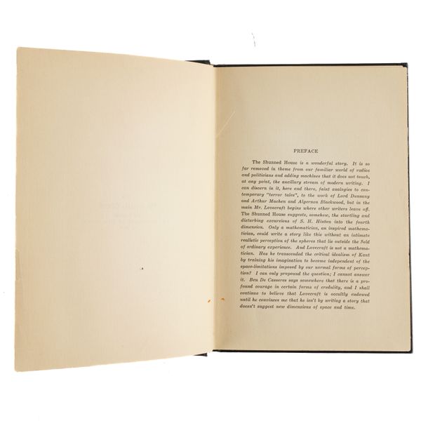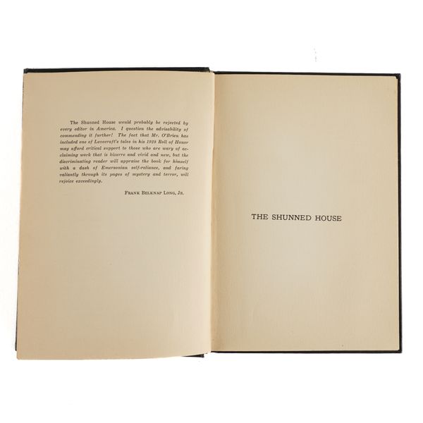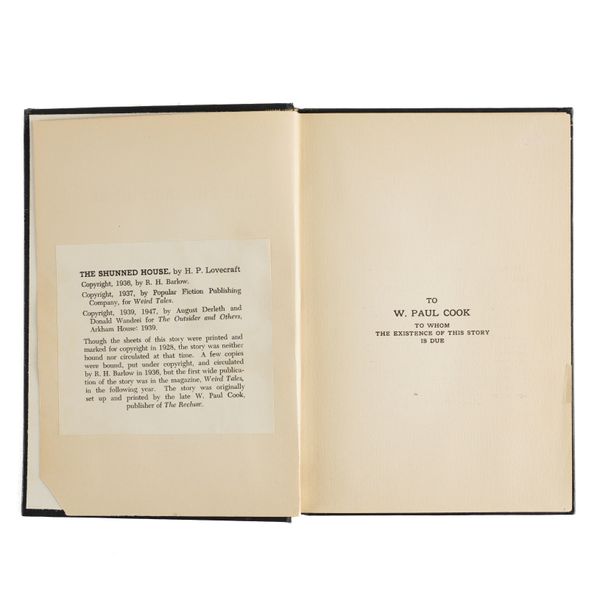 LOVECRAFT, H. P. (1890-1937). The Shunned House ... With a Preface by Frank Belknap Long, Jr. Athol, Massachusetts: "Published by W. Paul Cook. The Recluse Press, 1928" [but please see the important note below relating to this imprint]. 8vo (187 x 130mm). Small woodcut typographical ornament on the title page, printed on paper watermarked "Canterbury Laid" (inconspicuous small rectangular hole at the lower gutter of the title page, very small triangular piece of the lower fore-corner of the title page cut away, 2 tiny marginal tears to the dedication and preface leaves, faint marginal spot on p.43). Original black publisher's [i.e. Arkham House] cloth, the spine lettered in gilt (the gilt lightly rubbed, but more heavily to the word "House" of "Arkham House"), housed in a black morocco-backed book box with a black morocco label on the upper cover lettered in gilt. Provenance: Spokane Community College (very faint, easily missed, stamps on the top and bottom edges); small unidentified pictorial label at the foot of the front pastedown of the box. Frank Belknap Long's preface to the book opens: "The Shunned House is a wonderful story. It is so far removed in theme from our familiar world of radios and politicians and adding machines that it does not touch, at any point, the ancillary stream of modern writing. I can discern in it, here and there, faint analogies to contemporary 'terror tales', to the work of Lord Dunsany and Arthur Machen and Algernon Blackwood, but in the main Mr. Lovecraft begins where other writers leave off ..." On the verso of the title, pasted over the original copyright details, is a printed note stating: "THE SHUNNED HOUSE [in bold], by H. P. Lovecraft. Copyright, 1936, by H. R. Barlow. Copyright, 1937, by Popular Fiction Publishing Company, for Weird Tales. Copyright, 1939, 1947, by August Derleth and Donald Wandrei for The Outsider and Others, Arkham House: 1939. Though the sheets of this story were printed and marked for copyright in 1928, the story was neither bound nor circulated at that time. A few copies were bound, put under copyright, and circulated by R. H. Barlow in 1936, but the first wide publication of the story was in the magazine, Weird Tales, in the following year. The story was originally set up and printed by the late W. Paul Cook, publisher of The Recluse." S. T. Joshi, the author of the now standard and most exhaustive bibliography of H. P. Lovecraft, opens his Introduction to the work with the words: "The difficulties involved in Lovecraft bibliography may perhaps be as formidable as those for any writer of the twentieth century ..." and this statement may be seen as particular pertinent to any discussion of "The Shunned House." The following is an edited extract from Joshi's extensive entry: "The legendary stillborn first 'book' by Lovecraft ... Cook printed approximately 300 copies in mid-1928 ... but bound none ... Paper bears the watermark 'Canterbury Laid' ... In 1934 Barlow received about 225 copies of the unbound sheets. It is rumoured that he bound only eight copies ... Of the 225 copies, Barlow apparently distributed only about 50, having found some unusable. COPIES BOUND OR DISTRIBUTED BY ARKHAM HOUSE ... Arkham House, when obtaining the remainder of the unbound sheets, bound or distributed 150 as follows: 50 unbound copies bear a printed label pasted over the original copyright notice; 100 are bound in black cloth bearing the printed copyright notice. Spine stamped in gold. The former were distributed ca. 1959; the latter ca. 1961. The Arkham House copyright label is in two states: the one for the unbound sheets prints books and other magazine titles in boldface; that for the bound sheets prints these titles in italics" (Joshi). Wikipedia states of the Arkham House issue: "The genuine item, watermarked 'Canterbury', is the rarest book associated with Arkham House (several variants exist involving the copyright notice). It is considered the 'holy grail' for Arkham House collectors ..." Bleiler The Guide to Supernatural Fiction (1983) 1037; Brennan H. P. Lovecraft: A Bibliography (1952), p.1; Currey Science Fiction and Fantasy Authors: A Bibliography (1979) p.325; Jaffery The Arkham House Companion (1992) 62; Joshi H. P. Lovecraft: A Comprehensive Bibliography (2009) A5; cf. Ransom Private Presses and their Books (1929) p.394 (citing Cook's 300 unbound copies printed in 1928). LIMITED TO 300 COPIES, THIS ONE OF 100 ISSUED BY ARKHAM HOUSE AND BOUND IN BLACK CLOTH. EXCEPTIONALLY RARE.