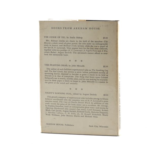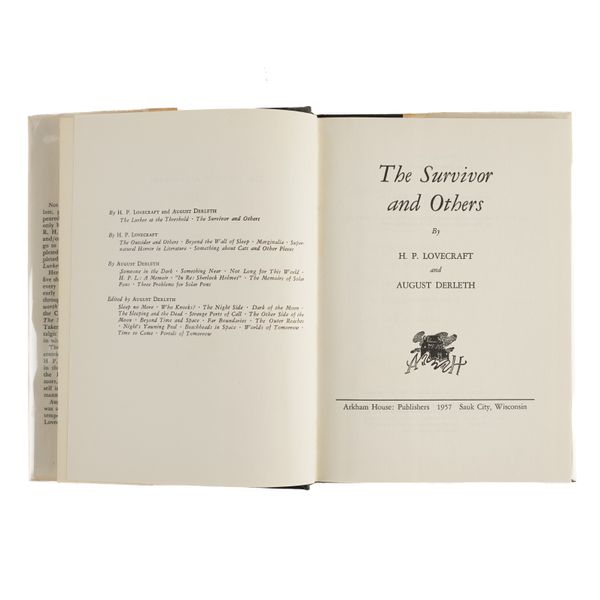 LOVECRAFT, H. P. (1890-1937) & August DERLETH (1909-71). The Survivor and Others. Sauk City, Wisconsin: Arkham House, 1957. 8vo (187 x 135mm). Half title, woodcut printer's device on the title. Original black cloth, the spine lettered in gilt, dust-jacket by Ronald Clyne with price of $3.00 unclipped (some light staining to the edges of the lower wrapper of the jacket). Provenance: David Slafer (bookplate); Messrs. Berkelouw (small bookseller's label on the front pastedown). FIRST EDITION. A printed note at the end states: "Two thousand copies of this book have been printed by The Collegiate Press, George Banta Company, Inc., Menasha, Wisconsin, from linotype Garamond on Winnebago Eggshell. The binding cloth is Holliston Black Novelex." A printed note on the front turn-in states: "These are tales of terrifying witchcraft, of cosmic horror, of quaint magic, such as only H. P. Lovecraft could have conceived. Here in these pages Great Cthulhu walks again, the Dunwich-Arkham country lives once more, and, in a final allegory, Lovecraft himself is portrayed in a quasi-autobiographical manner. August Derleth's completion of these stories was a labor of love. Perhaps no other contemporary writer has so closely emulated the Lovecraft style as he - as these stories testify." Please note that the original dust-jacket has been photographed in its modern protective archival Mylar wrapper, thereby avoiding any risk of damage through its temporary removal. Jaffery The Arkham House Companion (1992) pp.45-46; Joshi H. P. Lovecraft. A Comprehensive Bibliography p.190 (under "Apocrypha and Miscellany ... Collections").