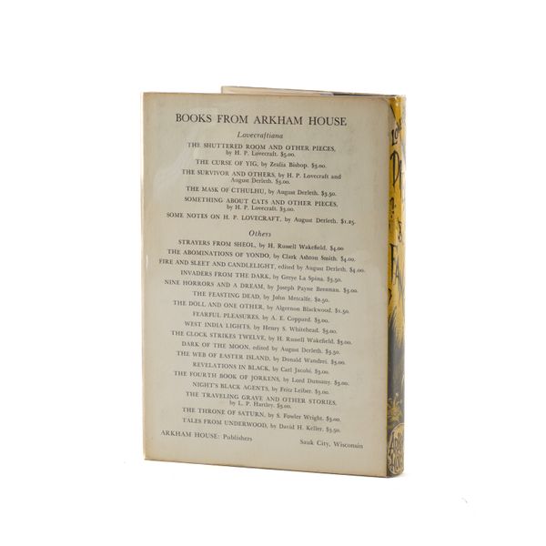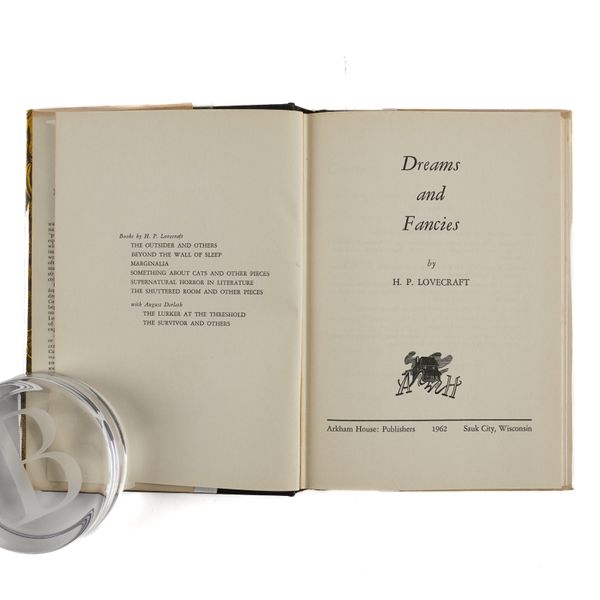 LOVECRAFT, H. P. (1890-1937). Dreams and Fancies. Sauk City, Wisconsin: Arkham House, 1962. 8vo (188 x 130mm). Half title, woodcut printer's device on the title. Original black cloth, the spine lettered in gilt, grey endpapers, the dust-jacket by Richard Taylor with the price of $3.50 unclipped (some staining to the internal edges of the jacket). A FINE COPY OF THE FIRST EDITION. A printed note at the end states: "Two thousand copies of this book have been printed by The Collegiate Press, George Banta Company, Inc., Menasha, Wisconsin, from Linotype Garamond on Winnebago Eggshell. The binding cloth is Holliston Black Novelex." Please note that the original dust-jacket has been photographed in its modern protective archival Mylar wrapper, thereby avoiding any risk of damage through its temporary removal. Bleiler The Guide to Supernatural Fiction (1983) 1050; Jaffery The Arkham House Companion (1992) 66; Joshi H. P. Lovecraft: A Comprehensive Bibliography (2009) A33: "A selection of Lovecraft's letters discussing his dreams, followed by some stories directly inspired by his dreams."