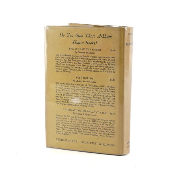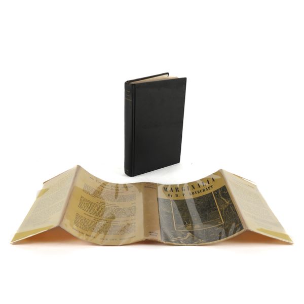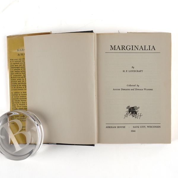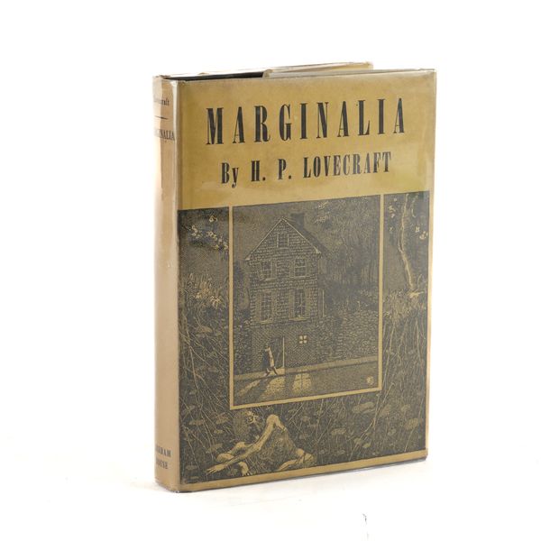 LOVECRAFT, H. P. (1890-1937). Marginalia ... Collected by August Derleth and Donald Wandrei. Sauk City, Wisconsin: Arkham House, 1944. 8vo (188 x 130mm). Half title, woodcut printer's device on the title, full-page half-tone illustrations (some light dampstaining to the upper margins). Original black cloth, the spine lettered in gilt, the dust-jacket by Virgil Finlay with the price of $3.00 unclipped (some light staining at the edges of the jacket, very short tear without loss to lower wrapper). FIRST EDITION. A printed note at the end states: "This book Marginalia was composed, printed and bound by the Collegiate Press, George Banta Publishing Company, Menasha, Wisconsin. It is composed in Linotype Caledonia and printed on White Winnebago Eggshell. The cloth is Holliston Novelex." Please note that the original dust-jacket has been photographed in its modern protective archival Mylar wrapper, thereby avoiding any risk of damage through its temporary removal. Bleiler The Guide to Supernatural Fiction (1983) 1042; Jaffery The Arkham House Companion (1992) 8; Joshi H. P. Lovecraft: A Comprehensive Bibliography (2009) A19: "... dust-jacket illustration by Virgil Finlay (reproduction of his illustration for 'The Shunned House' in Weird Tales, October 1937). Interior illustrations include photographs of Lovecraft's correspondents, of Lovecraft's home, illustrations by Lovecraft, facsimiles of letters and mss. in his hand, and Alfred Galpin's composition for piano solo, 'Lament for H. P. L.' 2,035 copies."