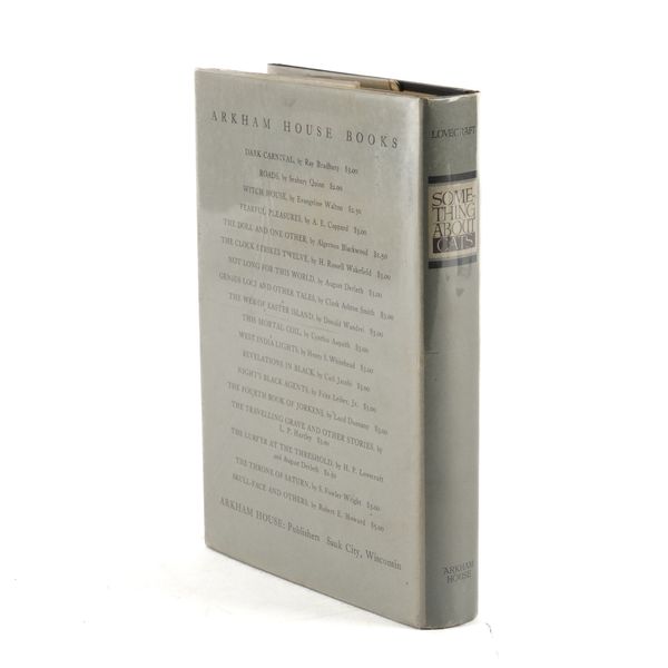 LOVECRAFT, H. P. (1890-1937). Something about Cats and Other Pieces. Collected by August Derleth. Sauk City, Wisconsin: Arkham House, 1949. 8vo (188 x 130mm). Half title, half tone frontispiece portrait, woodcut printer's device on the title, 4 full-page half tone illustrations, other illustrations in the text (some staining to the illustrations and adjacent text leaves). Original black cloth, the spine lettered in gilt, grey endpapers, dust-jacket by Ronald Clyne with the price of $3.00 unclipped. Provenance: Ross Gordon Graves, August, 1950 (colourful bookplate); some minor pencil annotation, both grudging ("Quite good. Style quite like H.P.L.'s" on p.25, at the end of Sonia H. Greene's story "The Invisible Monster") and more encouraging ("Good dramatic reading brings out the fine lines in this story" on p.30, at the end of the same author's story "Four O'Clock"). FIRST EDITION of this collection of Lovecraft's writings which includes, in addition, "a round half dozen stories by other hands, in which Lovecraft took part, either by revision or suggestion ..." (from the front turn-in). A printed note at the end states: "Three thousand copies [but 2,995 (!) according to Joshi] of this book have been printed from Intertype Garamond by the Collegiate Press, George Banta Publishing Company, Menasha, Wisconsin. The paper is Winnebago Eggshell. The binding cloth is Holliston Black Novelex." Please note that the original dust-jacket has been photographed in its modern protective archival Mylar wrapper, thereby avoiding any risk of damage through its temporary removal. Bleiler The Guide to Supernatural Fiction (1983) 1047; Jaffery The Arkham House Companion (1992) 38; Joshi H. P. Lovecraft. A Comprehensive Bibliography A25: "... Illustrations include photographs of Lovecraft, Sonia Davis, Adolphe de Castro, and facsimiles of illustrations and notes in Lovecraft's hand. 2,995 copies."