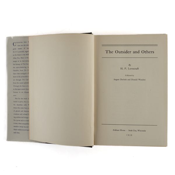 LOVECRAFT, H. P. (1890-1937). The Outsider and Others ... Collected by August Derleth and Donald Wandrei. Sauk City, Wisconsin: Arkham House, 1939. Large 8vo (231 x 155mm). Half title. Original black cloth, the spine lettered in gilt (some faint dust-soiling), the facsimile dust-jacket by Gerry de la Ree (printed c.1970s) after Virgil Finlay's original design with the price of $5.00 unclipped (slight creasing and short tears to turn-ins, not affecting letters). Provenance: "Supplied by The Seven Bookhunters, Station O. Box 22, New York II, N.Y. Out-of-Print Books" (small blue label at the foot of the rear pastedown). FIRST EDITION of "the first major collection of Lovecraft's tales" (Joshi) and the first book printed by Arkham House which was founded by the editors of the present work to specialise in the publication of "weird fiction", and which E. F. Bleiler described as "... the beginning of serious specialist publishing of fantastic fiction in America." A printed note at the end states: "Twelve hundred copies of this book have been printed by The Collegiate Press, George Banta Publishing Company, from linotype Caslon on White Winnebago Eggshell. The binding cloth is Bancroft Arrestox black natural finish". The introduction by August Derleth and Donald Wandrei opens: "[H. P. Lovecraft] is dead now: on March 15th, 1937, in his forty-seventh year: and in his death was lost to twentieth century American letters one of its most rational minds, a gentleman of the eighteenth century, a master of cosmic horror. His passing aroused spontaneous grief among all who knew him - not alone for the qualities of the man, but for the unique position he held in the world of contemporary literature." Please note that the dust-jacket has been photographed in its modern protective archival Mylar wrapper, thereby avoiding any risk of damage through its temporary removal. Bleiler The Guide to Supernatural Fiction (1983) 1040: "... a major book in the history of American supernatural fiction ... reveals a vivid imagination, a remarkable ability at the creation of mythic thought, an excellent command of scholarly detail, and many of the indescribable characteristics of a powerful mind at work ... ; Currey Science Fiction and Fantasy Authors: A Bibliography (1979) p.324; Jaffery The Arkham House Companion (1992) 1; Joshi H. P. Lovecraft: A Comprehensive Bibliography (2009) A15: "... First major collection of Lovecraft's tales, published posthumously by the firm founded by Derleth and Wandrei; 1,268 copies." RARE. ***Please note the important amendment to the description of the dust-jacket.***