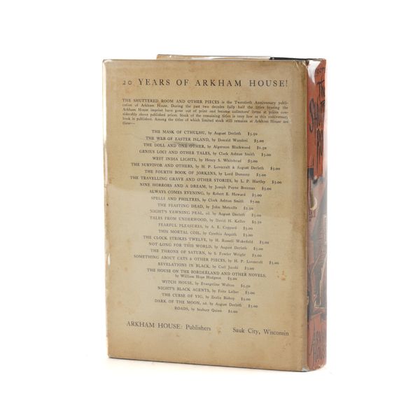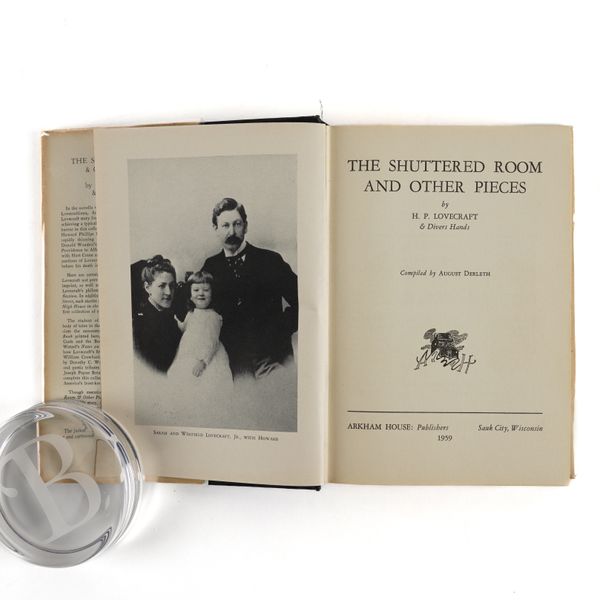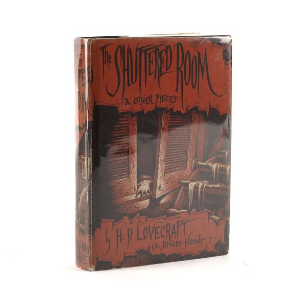 LOVECRAFT, H. P. (1890-1937), and others. The Shuttered Room and Other Pieces ... Compiled by August Derleth. Sauk City, Wisconsin: Arkham House, 1959. 8vo (187 x 130mm). Half title, half tone frontispiece, woodcut printer's device on the title, and 4 plates, small "chart" on p.45. Original black cloth, the spine lettered in gilt, grey endpapers (the gilt lettering on the spine slightly abraded in places), the dust-jacket by Richard Taylor with the price of $5.00 unclipped (some staining to the internal edges). Provenance: Frank Dowse (signatures in purple ink to the front and rear endpapers). A FINE COPY OF THE FIRST EDITION. A printed note at the end states: "Two thousand five hundred copies of this book have been printed from Linotype Garamond by the Collegiate Press, The George Banta Company, Menasha, Wisconsin. The paper is Winnebago Eggshell. The binding cloth is Holliston Black Novelex." Please note that the original dust-jacket has been photographed in its modern protective archival Mylar wrapper, thereby avoiding any risk of damage through its temporary removal. Bleiler The Guide to Supernatural Fiction (1983) 1049; Jaffery The Arkham House Companion (1992) 56; Joshi H. P. Lovecraft: A Comprehensive Bibliography (2009) A32: "Interior illustrations include photographs of Lovecraft and his family, his homes, some sites in Providence that inspired his tales, and reproductions of illustrations by Frank Utpatel."