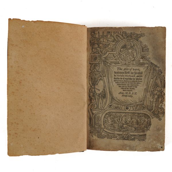 MACHIAVELLI, Niccol (1469-1527). The Arte of Warre, written first in Italia ... and set forthe in Englishe by Peter Whitehorne, student of Graies Inn: with an addicio of other like Marcialle feates and experimentes, as in a Table in the ende of the Booke maie appere. [London: Printed by John Kingston for] Nicolas Englande, July 1560. Small 4to (196 x 130mm). Title within wide woodcut pictorial border, fine woodcut initials, black letter, blank leaf before title and after folio C.viii (the title torn and laid down with significant loss to two corners, lacking the three leaves of the translator's dedication to Queen Elizabeth I [a2-4], lacking all after folio C.viii [i.e. after signature [Ddiv], being Eei-Hhii, see Cockle], the final text leaf with two repaired tears without loss, lightly and consistently browned throughout, a darker stain to the lower quarter of some leaves, more particularly to folios lxxvii-lxxxvii). Old calf (scuffed, rubbed at the corners, rebacked). Provenance: some modern pencil annotation to the endpapers. THE FIRST EDITION IN ENGLISH AND THE FIRST OF ANY WORK BY MACHIAVELLI TO BE TRANSLATED INTO ENGLISH. Machiavelli's Libro della arte della guerra was first published in Florence in 1521, the only of his works to be published in his lifetime. It takes the form of a series of Ciceronian dialogues between notable historical figures of the Florentine Republic - most notably Fabrizio Colonna and Bernardo Rucellai - and is divided into a preface and seven books. The present copy of the first English translation of The Arte of Warre ends on folio C.viii of the seventh book and, taking into account the defects and omissions stated, can be considered substantially complete in itself, although anything corresponding to the "... addicio of other like Marcialle feates and experimentes, as in a Table in the ende of the Booke maie appere" referred to in the title are not present. However, some confusion has arisen - including for this cataloguer - over what constitutes a complete English edition, in part, perhaps, because of the great scarcity of the first, and an over-dependence on the copy in the British Library as an exemplar for all other copies. In the second English edition, printed in 1573 [or 1574], the significant words: "Newly imprinted with other additions" appear on the title page which are absent from the first: these "additions" principally take the form of Peter Whitehorne's Certain wayes for the orderying of souldieurs in battelray. While being published as a separate work in 1562, it was often bound into the author's second English edition of the Machiavelli as a kind of supplement to the principal work which he had translated, whilst retaining its own elaborately engraved title page and foliation. Cockle, the military bibliographer, treats them as separate works, although alludes to their association, and a modern pencil note on the final blank of the present copy states, unambiguously: "A separate work [Cockle 13] dated 1562 is often bound with this book." The description of the British Library's copy of the first English edition of The Arte of Warre refers to the the presence of Certain wayes for the orderying of souldieurs but hedges its bets by putting the title of the latter in brackets, stating the whole work is in two parts, and formatting the date, idiosyncratically, as "1560 1562" (i.e. un-hyphenated), and it may be that the presence of the second work here, bound in with the first, has contributed to the questionable notion that they are integral parts of the same work. The DNB also refers to this dating discrepancy, with the title page to The Arte of Warre dated 1560 and the colophon (presumably at the end of Whitehorne's second, additional, work) dated 1562: "About 1550 [Whitehorne] was serving in the armies of the emperor Charles V against the Moors ... While in Africa he translated into English from the Italian Machiavelli's treatise on the art of war, but it was not published until ten years later, when Whitehorne terms it 'the first fruites of a poore souldiour's studie'. It was dedicated to Queen Elizabeth ... The title-page is dated 'Anno MDLX. Mense Julii', but the colophon has 'MDLXII Mense Aprilis.' Other editions appeared in 1573-4 and 1588, both in quarto" (DNB). Bertelli & Innocenti Bibliografia Machiavelliani (1979) 131 (supporting Cockle's view that the "supplementary" work by Whitehorne is a separate one that has been bound into the BL copy); cf. Brunet III, 222 (citing the first Italian edition of 1521, "fort rare"); Cockle A Bibliography of British Military Books up to 1642 (1957) 12; STC 17164. See also Alexander Lee's Machiavelli. His Life and Times (2020), pp.449-455, and Robert Black's Machiavelli. From Radical to Reactionary (2022), pp.149-155, for full accounts of the inception and publishing history of Libro della arte della guerra. VERY RARE.