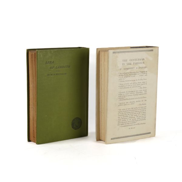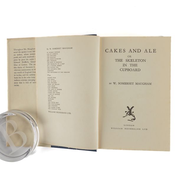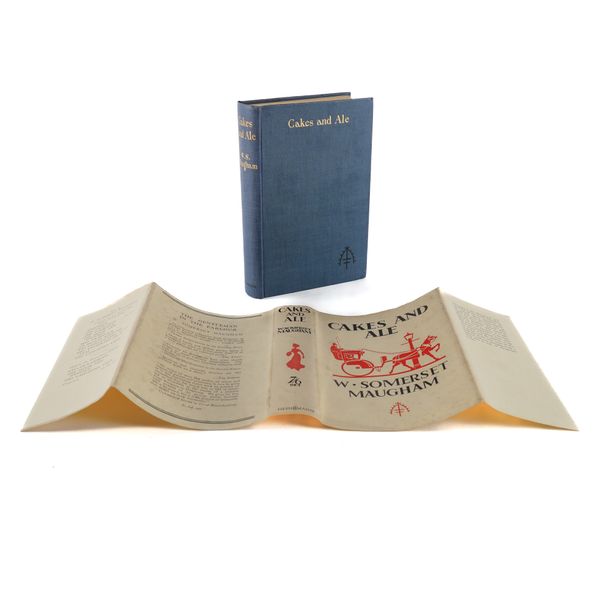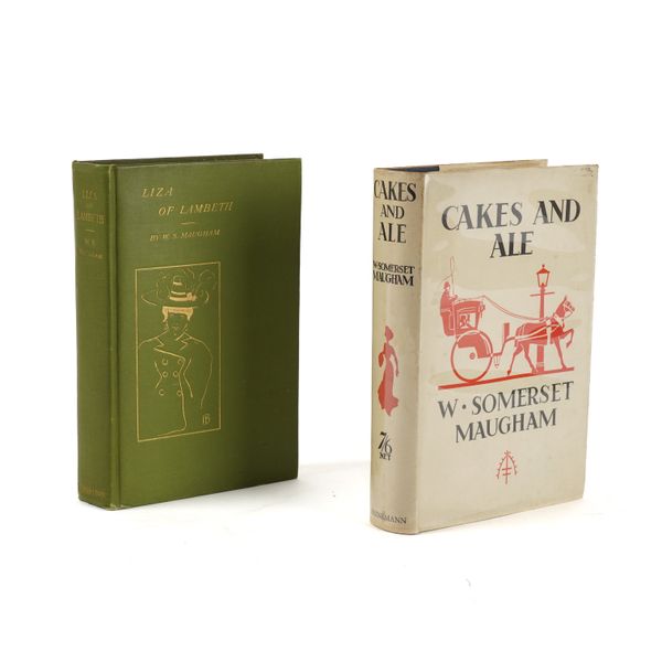 MAUGHAM, William Somerset (1874-1965). Cakes and Ale. Or the Skeleton in the Cupboard. London: William Heinemann Ltd., 1930. 8vo (185 x 120mm). Half title, publisher's woodcut device on title. Original blue cloth lettered in gilt with Maugham's ancient Moorish symbol on the upper cover, dust-jacket printed in black and red with price of 7/6 on the backstrip (some very light staining to the jacket). FIRST EDITION. Stott The Writings of William Somerset Maugham: A Bibliography (1956) A40a. With the same author's Liza of Lambeth ... Second Edition (London, Fisher Unwin, 1897, 8vo, in VERY FINE original green pictorial cloth gilt. (2)