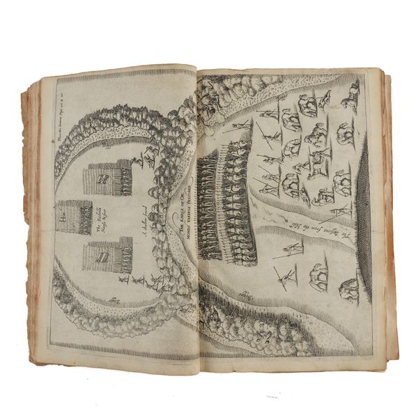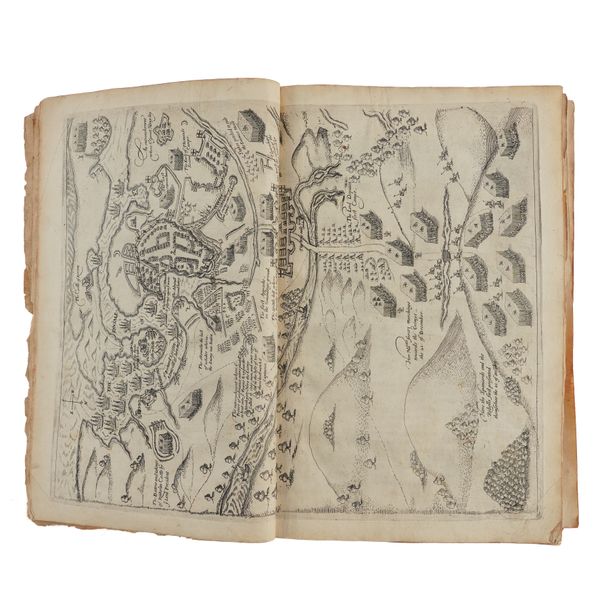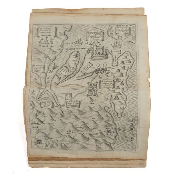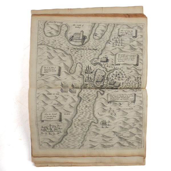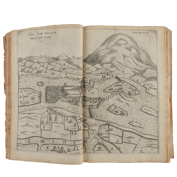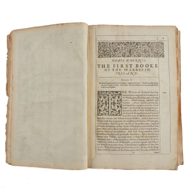 [STAFFORD, Thomas (?1576-1655), attributed]. Pacata Hibernia. Ireland Appeased and Reduced. Or, An Historie of the late Warres of Ireland, especially within the Province of Mounster, under the Government of Sir George Carew ... Wherein the Siedge of Kinsale, the Defeat of the Earle of Tyrone, and his Armie; the Expulsion and sending home of Dun Juan de Aguila, the Spanish Generall, with his Forces; and many other remarkable passages of that time are related. London: "Printed for Aug. Matthewes for Robert Milbourne, at the Signe of the Grey-hound in Pauls Church-yard," 1633. Folio (332 x 210mm). Fine engraved portrait of Elizabeth I, woodcut device on the title and at the end, initials and head-pieces, 16 engraved maps only, all but one double-page (lacking the portrait of Carew and 2 maps including the map of Munster by John Speed [as often], several maps detached, D3 torn [text leaf] without loss, dark spot on Mm3, a few blank corners torn away). Old calf spine still holding the text block, but lacking the covers. Provenance: old illegible inscription on the front free endpaper. FIRST EDITION. Please see Thomas Stafford's entry in DNB which expresses some doubts as to the attribution of this work, and even some confusion as to the author's identity. Brunet IV, 335: "Edition rare et recherchée, qui doit contenir 2 portr. (la reine Elizabeth et G. Carew), et plusieurs cartes, dont la première (Munster) manque souvent, ou est remplacée par une copie moderne ... [not the case in this copy]"; STC 23132.