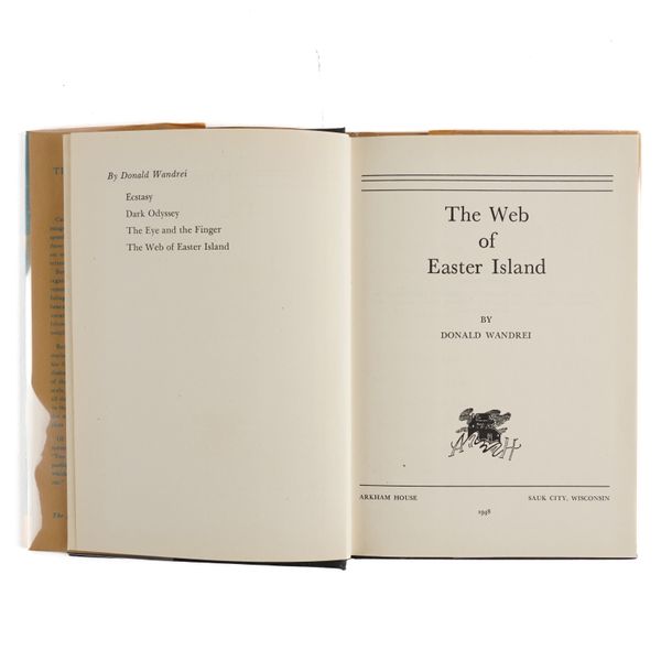 WANDREI, Donald (1908-87). The Web of Easter Island. Sauk City, Wisconsin: Arkham House, 1948. 8vo (184 x 130mm). Half title, woodcut printer's device on the title. Original black cloth, the spine lettered in gilt, the dust-jacket by Audrey Johnson with the price of $3.00 unclipped. A FINE COPY OF THE FIRST EDITION. A printed note at the end states: "Three thousand copies of this book have been printed from linotype Baskerville by the Collegiate Press, George Banta Publishing Company, Menasha, Wisconsin. This book is printed on Winnebago Eggshell. The binding cloth is Holliston Black Novelex." The book bears a printed dedication by the author to H. P. Lovecraft, who is mentioned on the front turn-in: "Of The Web of Easter Island, read in manuscript, the late H. P. Lovecraft wrote: 'You will like this novel - especially the poetically cosmic second half, one chapter of which is a masterpiece of underground horror'." Please note that the original dust-jacket has been photographed in its modern protective archival Mylar wrapper, thereby avoiding any risk of damage through its temporary removal. Bleiler The Guide to Supernatural Fiction (1983) 1657; Jaffery The Arkham House Companion (1992) 32.