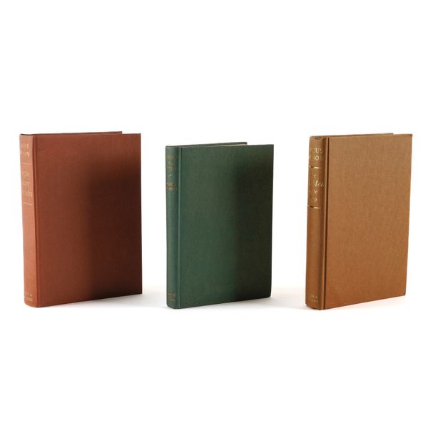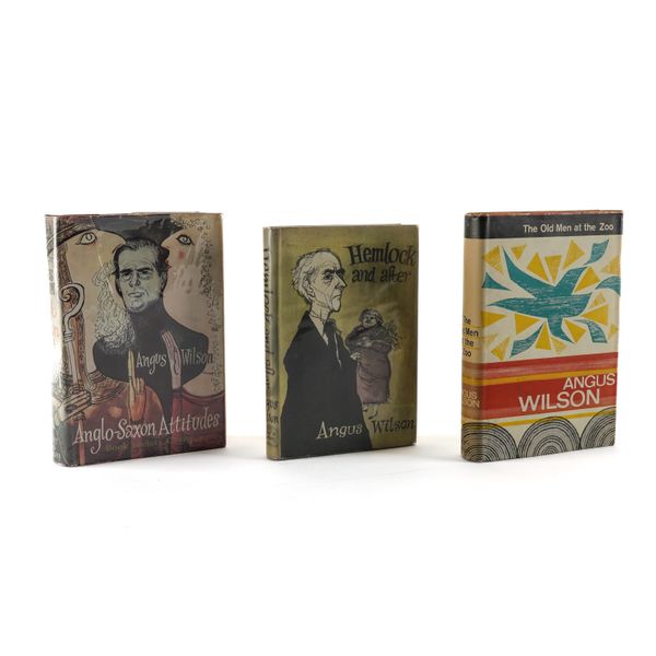 WILSON, Angus (1913-91). Anglo-Saxon Attitudes. London: Secker & Warburg, 1956. 8vo (193 x 132mm). Half title (some mainly marginal spotting and staining to the first few leaves including the half title and title, spotting at edges). Original terracotta cloth, the spine lettered in gilt, dust-jacket by Ronald Searle with the price of 15s. unclipped (some tiny marginal tears). Provenance: "May 1956" (very small stamp on the front free endpaper). FIRST EDITION. Please note that the original dust-jacket has been photographed in its modern protective archival Mylar wrapper, thereby avoiding any risk of damage through its temporary removal. With the same author's Hemlock and After (London, 1952, 8vo, original green cloth, dust-jacket) and The Old Men at the Zoo (London, 1961, 8vo, original tan cloth, dust-jacket), both FIRST EDITIONS. (3)