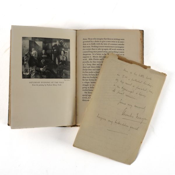 YERKES COLLECTION - Catalogue of Paintings and Sculpture in the Collection of Charles T. Yerkes Esq., New York. [Boston: A. W. Elson & Co.], 1904. 2 volumes, large 4to (360m x 265mm). Half titles, photogravure frontispiece portrait of Charles T. Yerkes, 200 photogravure plates (some light mainly marginal spotting and staining). FINELY BOUND IN CONTEMPORARY FULL STRAIGHT-GRAINED BLACK MOROCCO GILT, the covers with central Charles T. Yerkes' monogram within gilt-fillet borders with foliate cornerpieces, spines gilt in six compartments, top edges gilt, others uncut (some light rubbing and scuffing, extremities rubbed). FIRST EDITION. NUMBER 215 OF 250 COPIES. With a small quantity of art reference and miscellaneous books including Charles Morgan's Epitaph on George Moore (London, 1935, 8vo, plate of "Saturday Evening at the Vale" by Henry Tonks, original buckram-backed marbled paper boards, FIRST EDITION, PRESENTATION COPY, inscribed, "To Henry Tonks, in grateful recollection of other evenings at the Vale, from the author, Charles Morgan, November 22, 1935," with a further 2-page autograph letter from the author to Henry Tonks, with the same date as the presentation inscription, written in pencil from his sick-bed, concluding, "Here is the little book on G.M., published to-day. My big novel is finished, too [almost certainly Sparkenbroke, published in 1936], + the typescript is having its final revision. Yours very sincerely, Charles Morgan. Forgive my bedridden pencil." (qty)