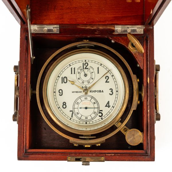 The brass-bound three-tier case with hinged lid above glazed observation panel, with a pair of brass drop carrying handles, the brass bowl with screwed bezel and deep bevelled glass, held in a brass gimbal, the 4 1/4in silvered dial, signed and numbered 9802, with subsidiaries for seconds and state of winding, the chain fusée movement with Earnshaw type escapement, bi-metallic compensated balance, freesprung steel helical spring with jewelled endstone, maker’s mark and number to the barrel bridge