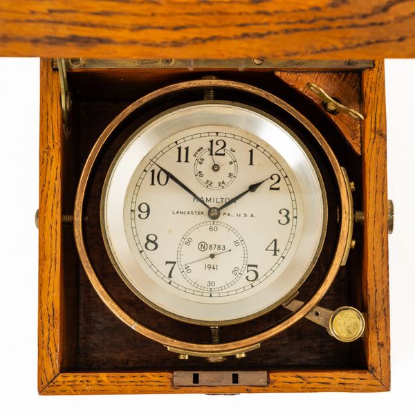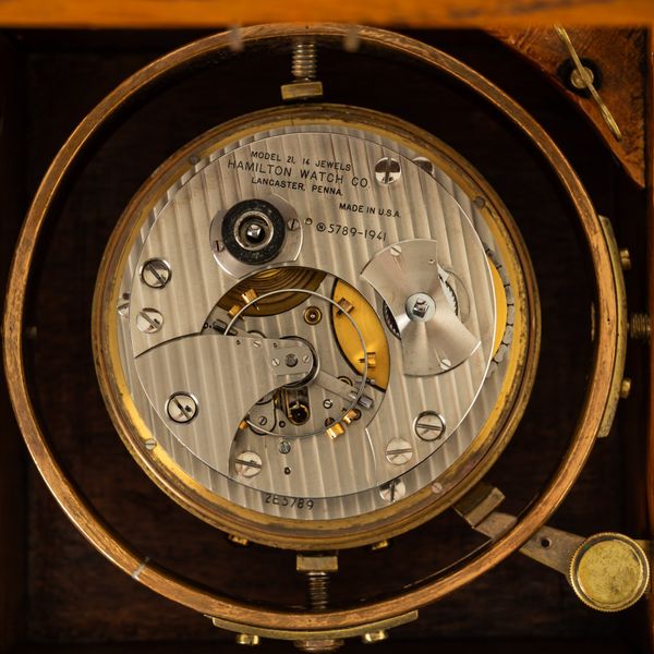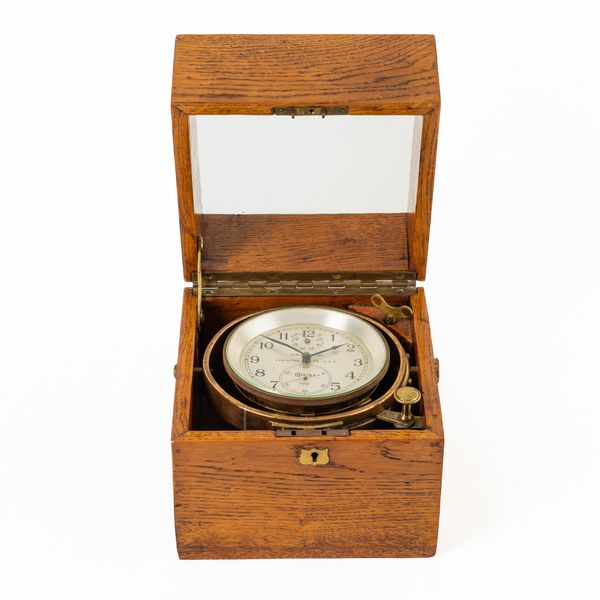 The two-tier case with hinged glazed cover, brass bowl and gimbals, with screwed bezel and bevelled glass, 4 1/4in circular silvered dial, signed, numbered and dated, with blued steel hands and subsidiaries for state of wind and seconds, the nickel-plated signed movement numbered 5789-1941 with chain fusée, maintaining power, compensated freesprung balance with Earnshaw type detent escapement