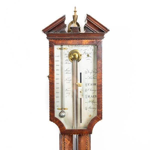 The architectural pediment above signed silvered scale and vernier, the trunk with glass tube and domed reservoir cover