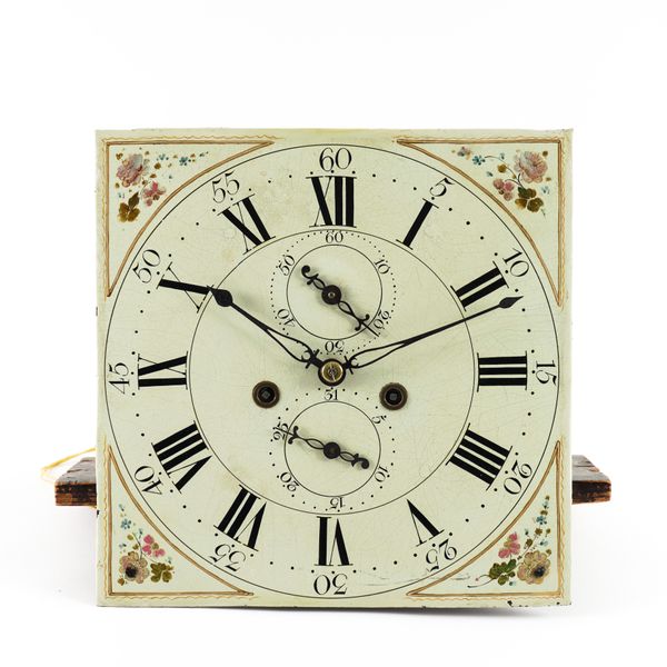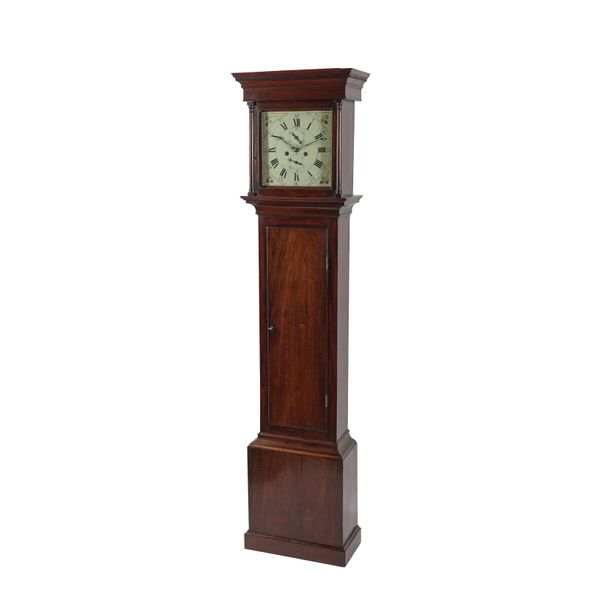 The case with a dentil moulded cornice above glazed door, flanked by slender three-quarter columns, above the trunk with rectangular panel door, above concave mouldings, stepped base with plinth, the 12in white painted dial, with foliate decorated spandrels, pierced spade hands, and seconds subsidiary and calendar ring, the twin train movement five pillar movement with anchor escapement and rack strike on a bell