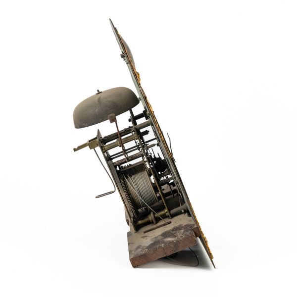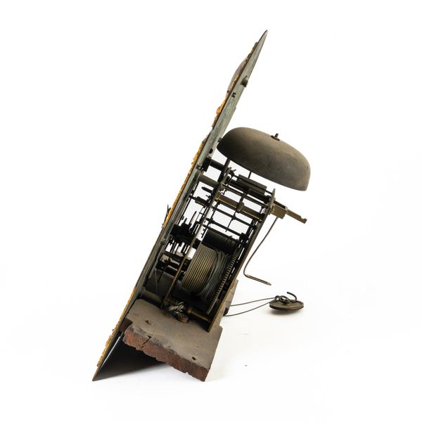 The case has been reduced in height at the base at some point. Later plinth. Losses to decoration and wear. The left-hand moulding above the base is loose and present. The backboard has split at some point and has been reinforced with a later board to the back for stability. The glass is cracked. The left side columns have lost their brass capitals, whilst the right-hand columns are both lost entirely. The bottom edge moulding to the door is lost. Both the top and base of the door have had wood removed from the back.