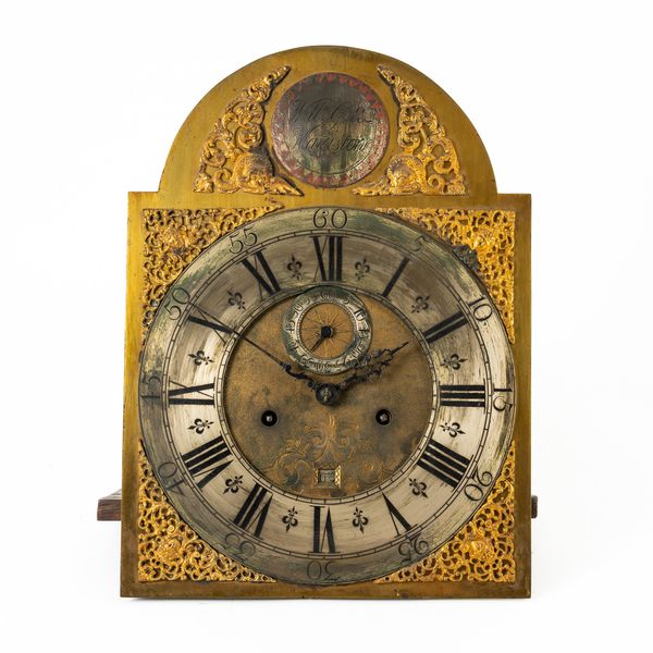 The case with a domed pediment, above a break arch glazed door and glazed sides, the trunk inset with an arched panel door decorated with pavilions and figures, above a stepped base and a plinth; the 12in arched brass dial, signed on a convex roundel Willam Gill, Maidstone, between dolphin spandrels, with silvered chapter ring below and pierced mask spandrels, enclosing a matted centre with seconds subsidiary and calendar aperture, the twin train movement with anchor escapement and strike on a bell