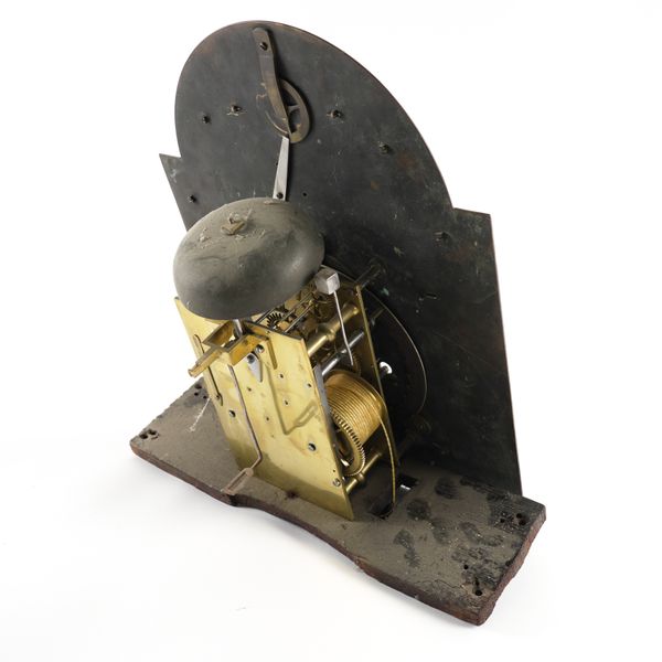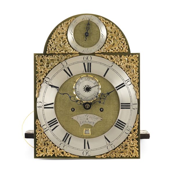 The arched hood with glazed door and sides, flanked by fluted and brass-stopped pillars, the trunk inset with an arched panel door, flanked to each side by a quarter-column with brass Corinthian column, on stepped base and plinth, the arched 12in dial with strike/silent in the arch, cast spandrels enclosing a silvered chapter ring, recessed seconds dial, signature panel and calendar aperture within the matted centre, five ringed pillar movement, anchor escapement and rack strike on a bell, case and movement associated