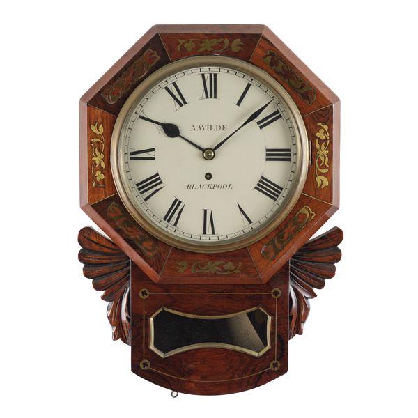 With octagonal surround, glazed brass bezel above 10in white painted dial inscribed A. WILDE / BLACKPOOL, blued steel hands, above the drop with a glazed aperture and flanked to each side by carved ears, the wire gut fusée movement with anchor escapement