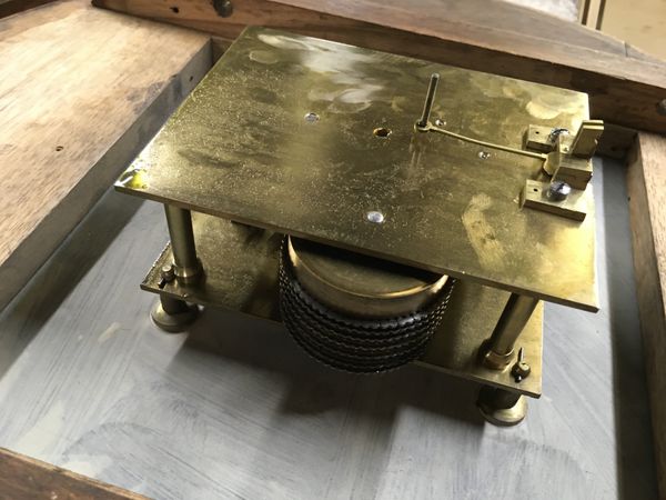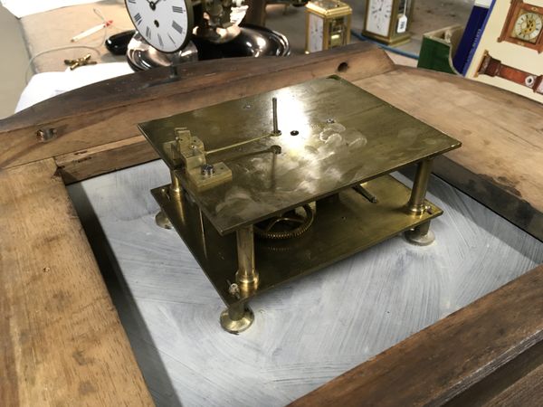 With pendulum. Case repolished. Tongue from bezel missing. Dial with overall craqueleur and paint lifting, some discolouration. Movement is oily and would benefit from a service.