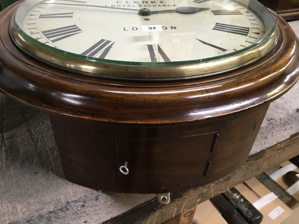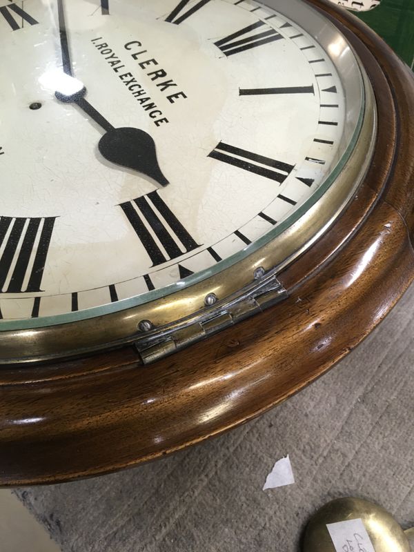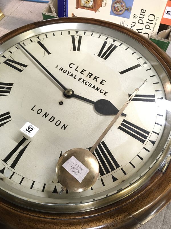 With moulded surround, casr bezel and bevelled glass, blued steel hands, cream painted dial inscribed CLERKE / 1 ROYAL EXCHANGE / LONDON, the twin train chain fusée movement with anchor escapement