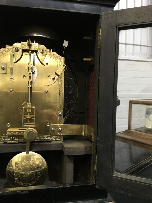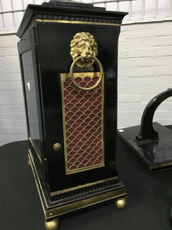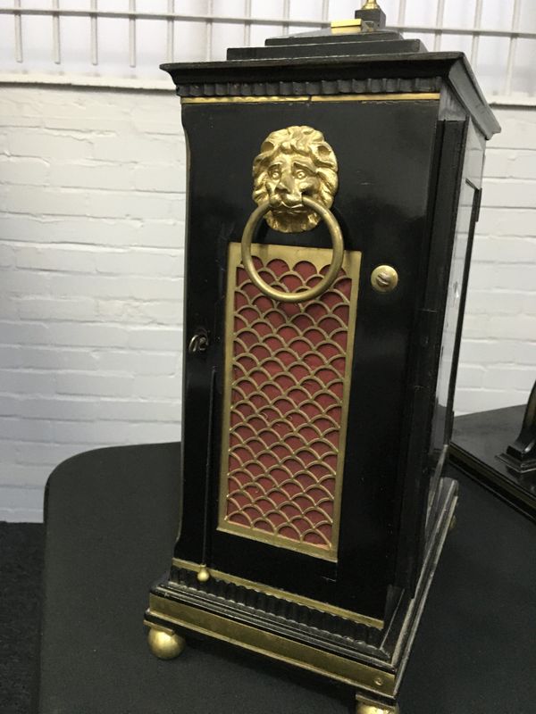 The chamfer top case surmounted by a pineapple finial, above panelled front and convex glazed 8in white-painted dial inscribed GRANT / Fleet Street / LONDON, with finely pierced blued steel hands, a lion mask carrying handle and brass fish-grille panel to each side, on a stepped base, on four brass ball feet, the twin train wire gut fusée movement, signed, with arched shoulders and engraved edge, with anchor escapement and striking the hour on a bell; together with its original bracket