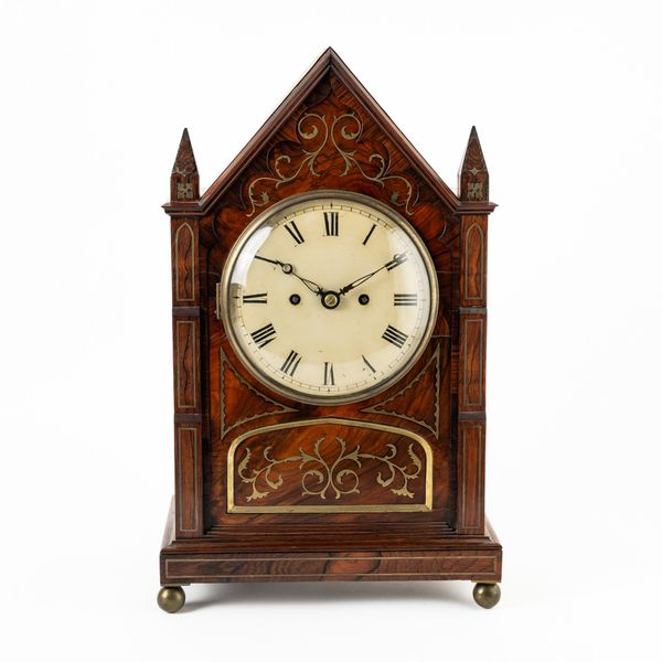 With an arched pediment and two finials, the panelled front centred with a convex glass above the cream-painted 7in dial, with pierced blued steel hands, on a stepped base and brass ball feet, the twin train gut fusée movement with strike on bell and anchor escapement