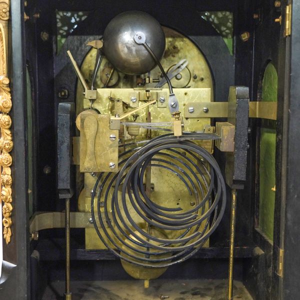 The case with stepped dome centre, surmounted by a large flame finial and with four smaller finials below, above moulded cornice, the front with a pair of cherub mask winged spandrels flanking an arched foliate cast door surround with bevelled plate, the 8 1/2in arched brass dial with matt gilt cast spandrels, three subsidiaries for Regulation; CHIME/SILENT; WESTMINSTER/TEN BELLS/EIGHT BELLS, with signature panel engraved J. C. JENNENS & SON / LONDON above the silvered chapter ring enclosing a matted centre with pierced blued steel hands, the canted case corners each with a female caryatid, the sides each with a cast handle above pierced cast mask panels, on a stepped base with foliate cast feet, the substantial three train chain fusée movement signed to the backplate J. C. JENNENS & SON / 25 & 26 GREAT SUTTON STREET / LONDON with long projecting pin wheel to chime each quarter on either 8 or 10 bells or four blued steel gongs, striking the hour on a larger fifth gong