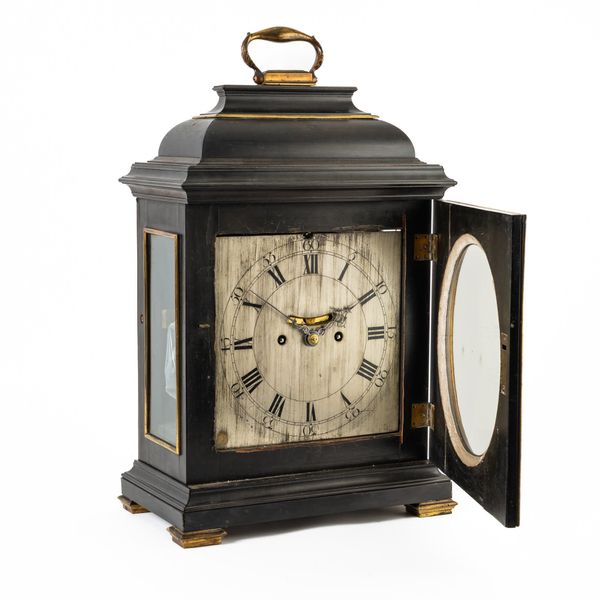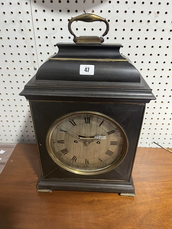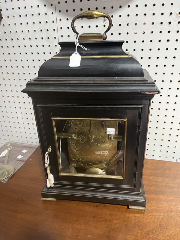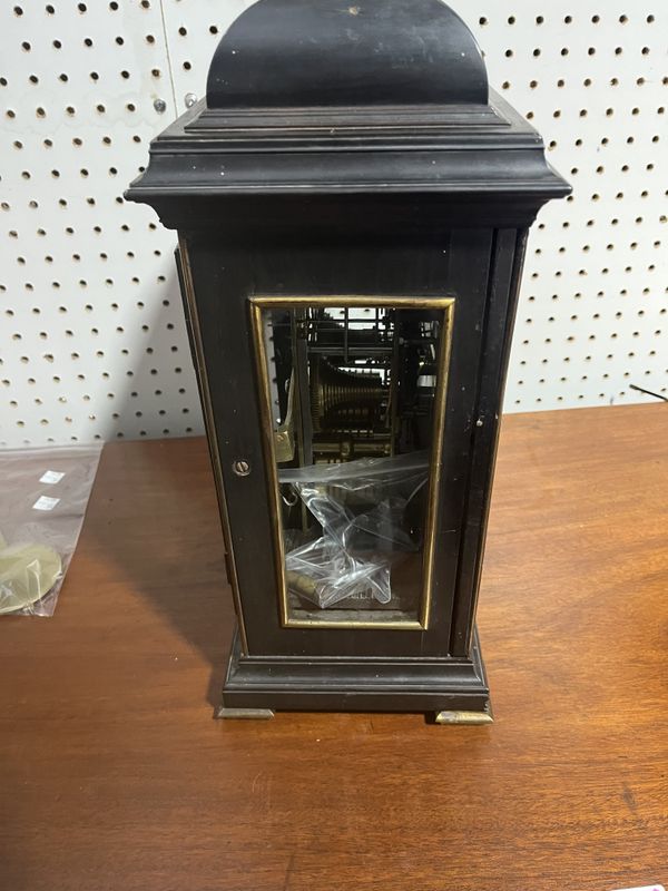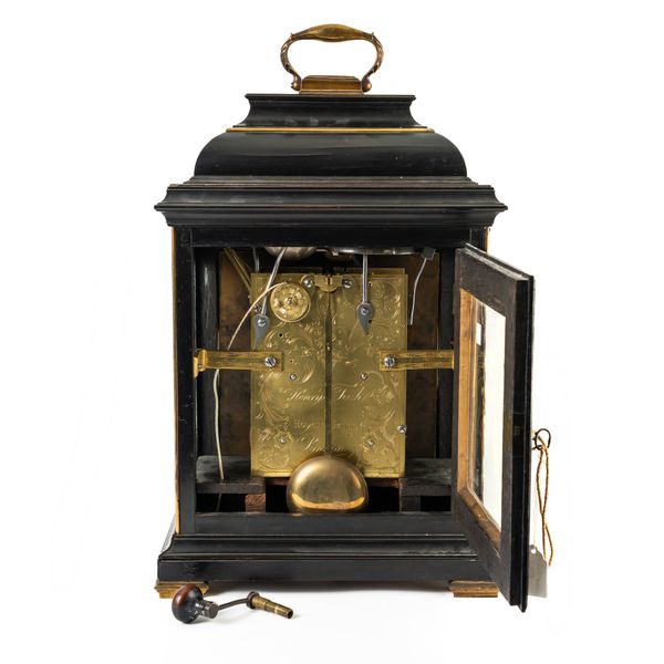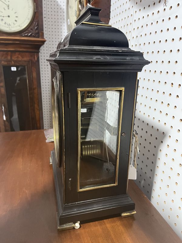 The Ellicott style case with inverted bell top, surmounted by a brass carrying handle above a domed pediment, and finely cut mouldings, with a hinged door below with circular glazed 8in brass edged opening to reveal the 8in square silver brass dial with finely cut steel hands and false pendulum aperture, strike/silent above the XII, the sides with a glazed rectangular panel, on a stepped base and brass feet, the twin train five-pillar wire gut fusée movement signed Henry Fish ROYAL EXCHANGE London, within an engraved plate, with pull-repeat on six bells, later anchor escapement (from verge) and hour strike on a further bell