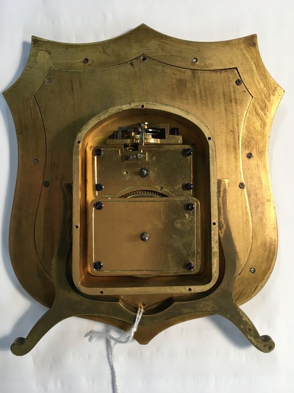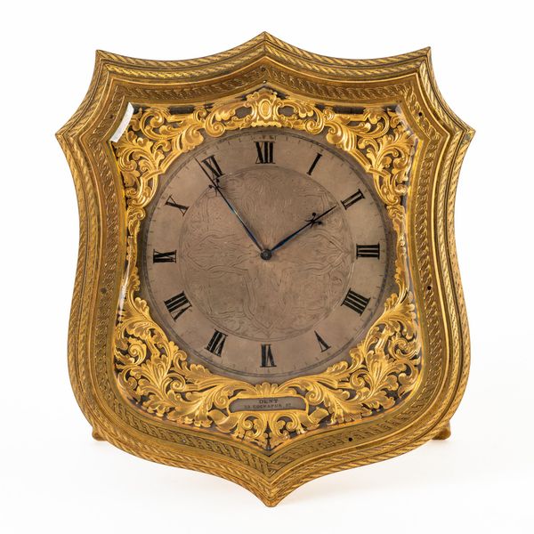 The stepped frame with shaped bevelled glass, pierced and engraved dial surround, signed silvered dial with fine blued steel trefoil hands, the lever movement with vertical platform lever escapement, the back of the case with shuttered hand adjustment and regulation with integral winding handle