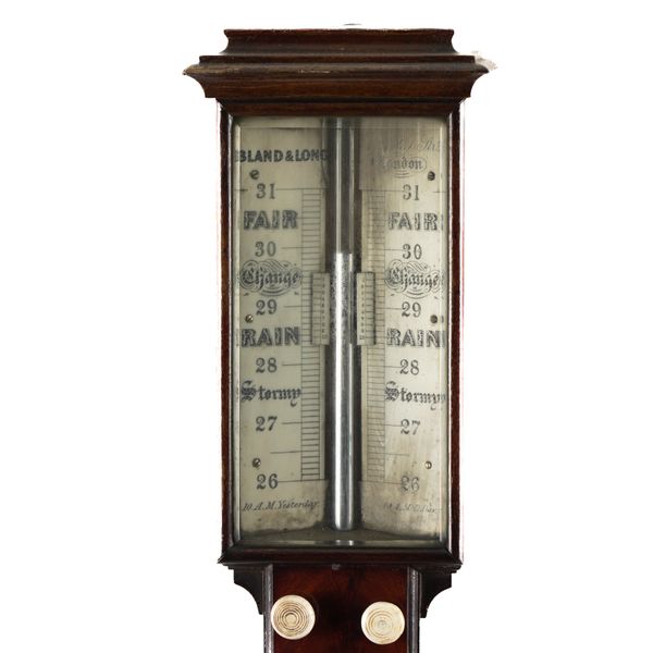 With stepped moulded pediment, bevelled glazed panel and engraved ivory scales, original thick glass Mercury-filled tube, above a well figured trunk, later fitted with a removable ivory scale glazed thermometer, held by a pair of polished brass screw heads, above a half turned cistern