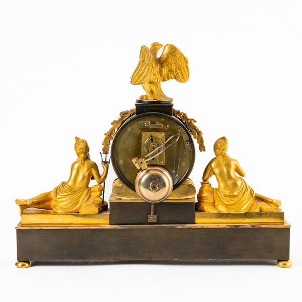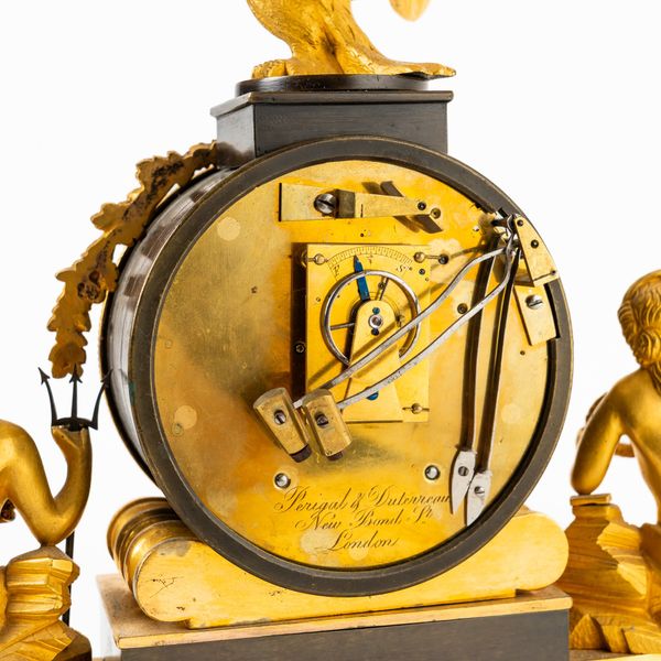 The case surmounted by an eagle and flanked to each side by a figure of Neptune and Minerva, between a beaded bezel and signed 3 1/2in white enamel dial with blued steel hands, on a rectangular base with ribbon-tied festoon, on bun feet, the signed twin train wire gut fusée movement with platform lever escapement, circular plates and striking the quarters on two bells and with hour strike on a single bell
