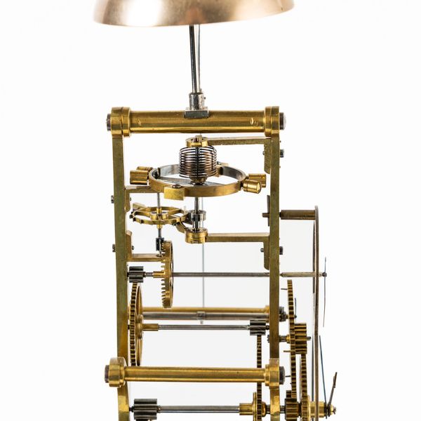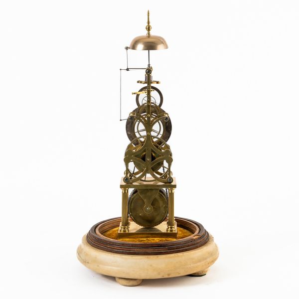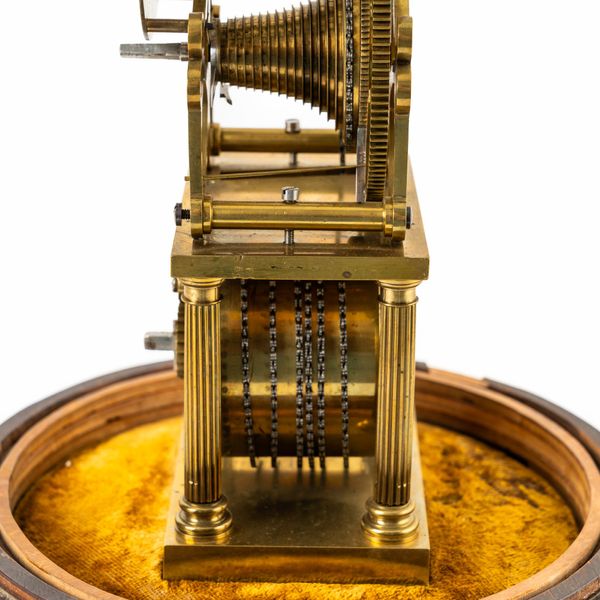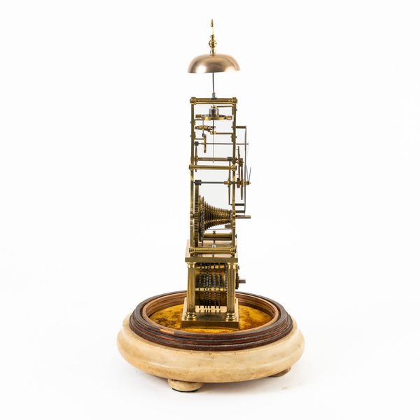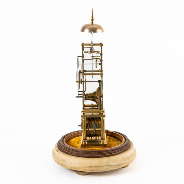 Surmounted by a bell, struck via polished steel linkage, above slender shaped frame, good wheel work of five crossings, the bi-metallic compensated balance with blued steel helical spring, above the projecting detent and escape wheel, with chain fusée and maintaining power, slender seconds ring above the signed chapter ring with blued steel moon hands, the barrel held within a frame of four fluted columns, on a block base, mounted on a white marble, velvet-lined plinth, with a glass dome (damaged)