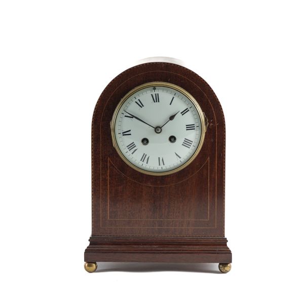 The arched case with boxwood stringing and chequer outlined front, 5in white enamel dial with blued steel hands, French twin train drum shaped movement striking on a bell