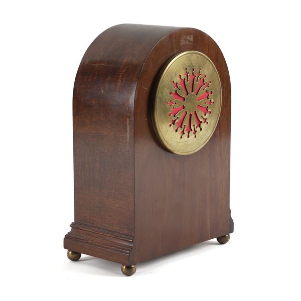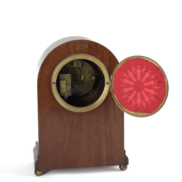with pendulum. Case in good condition, slight scuff mark to right side. Trace of veneer movement to arched top. The clock is working.